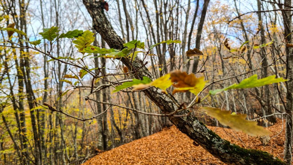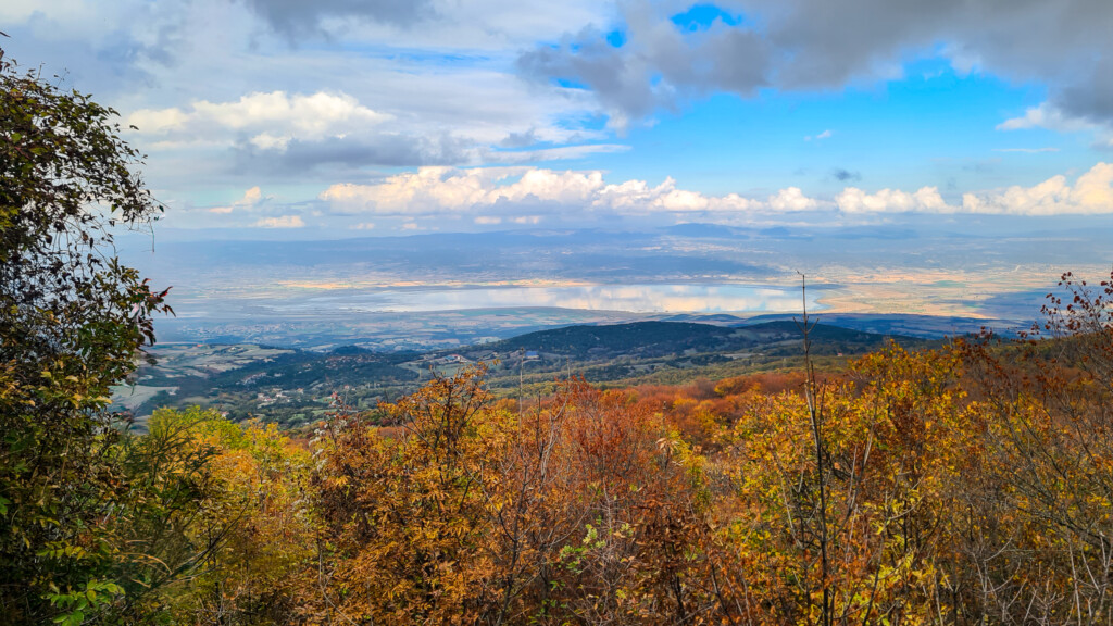 For the journey back you can return the same way through the forest or follow the wider loop that opens into bigger landscapes. As you descend, the view stretches over Lake Koroneia, the fields and the rooftops of Chortiatis village. Autumn paints everything in warm tones that make it almost impossible not to slow down and take it all in.