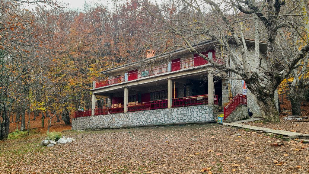 After around six and a half kilometres the forest thins out and the mountain shelter comes into view. Built from stone and tucked among tall beech trees, it sits at about a thousand metres altitude and feels like a warm, welcoming stop at the end of the trail.