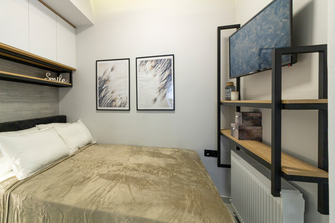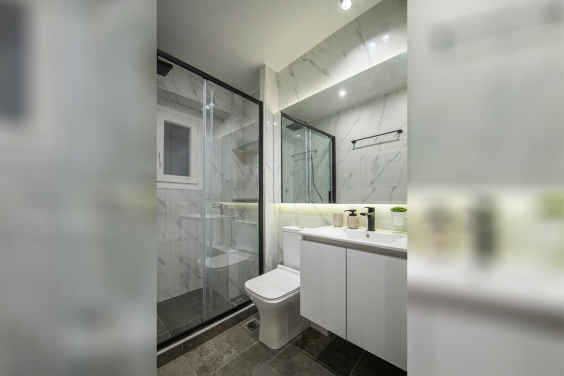 Το μπάνιο με τις κομψές του λεπτομέρειες και την πολυτελή ντουζιέρα προσφέρει μια εμπειρία που θυμίζει σπα. Κάθε λεπτομέρεια, από τον φωτισμό μέχρι την επίπλωση, έχει επιλεγεί προσεκτικά για να δημιουργήσει έναν χώρο που συνδυάζει το σικ με την άνεση.