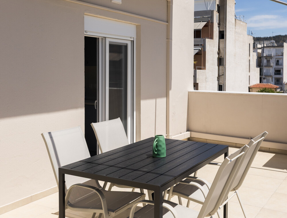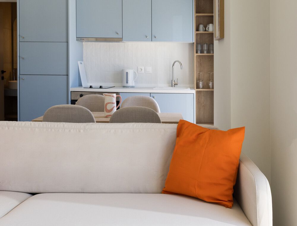 Η πλήρως εξοπλισμένη κουζίνα διαθέτει όλα τα βασικά για μαγείρεμα και βραστήρα, προσφέροντάς σας την ελευθερία να ετοιμάζετε γεύματα ή χαλαρά πρωινά όποτε επιθυμείτε. Βγείτε στο ιδιωτικό μπαλκόνι για να απολαύσετε τον πρωινό σας καφέ ή ένα ήσυχο ποτό το βράδυ στον καθαρό αέρα.