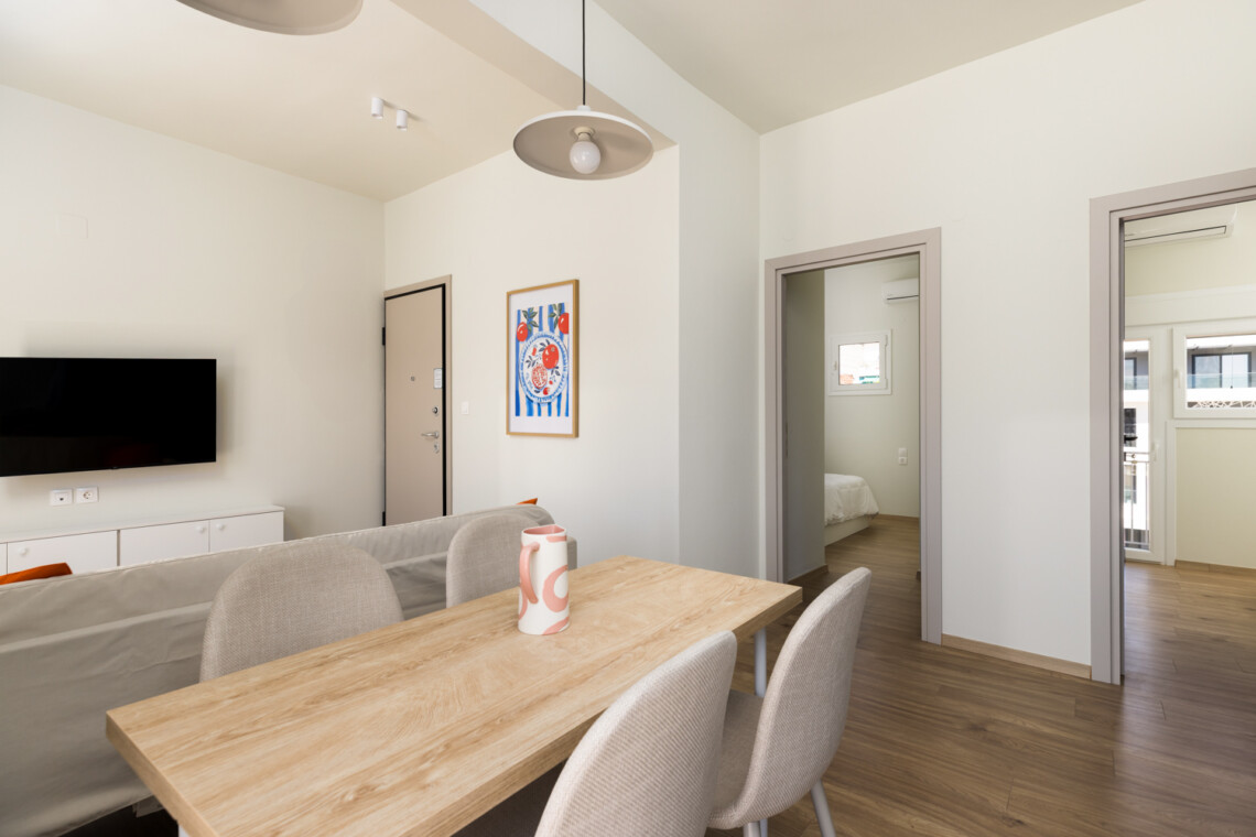 Το διαμέρισμα είναι φωτεινό, λειτουργικό και επιπλωμένο με προσοχή, με ανοιχτές ξύλινες αποχρώσεις και μοντέρνα απλότητα. Ο κλιματισμός εξασφαλίζει άνεση όλο τον χρόνο, ενώ οι επισκέπτες έχουν επίσης πρόσβαση σε κοινόχρηστο πλυντήριο ρούχων στο κτίριο, κάτι που το καθιστά ιδανικό για μεγαλύτερες διαμονές.