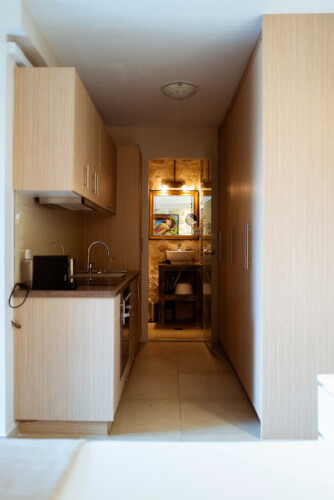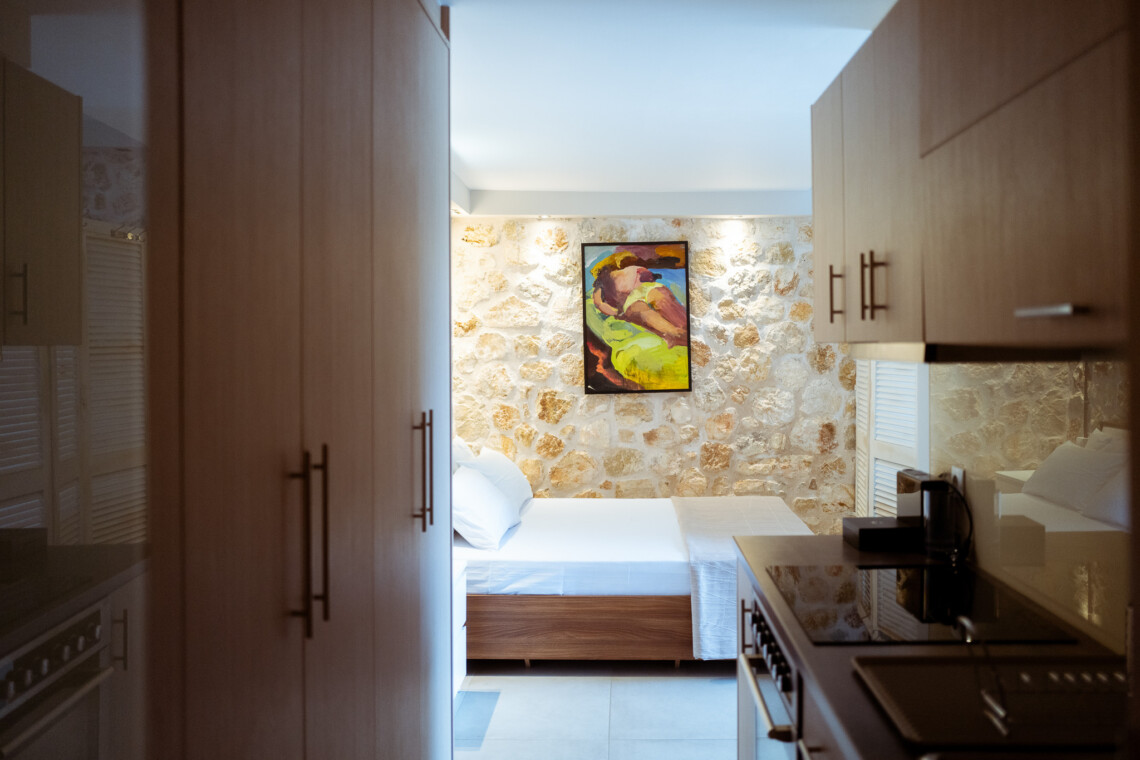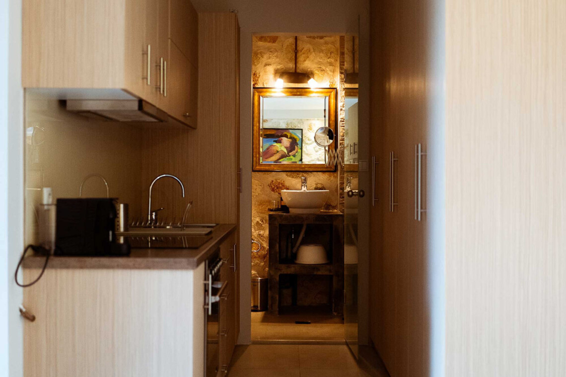 Inside, the suite comfortably accommodates up to 3 guests and includes one double bed and a cozy sofa bed. The living space is warm and thoughtfully arranged, while the private kitchen is fully equipped with everything you need for preparing light meals during your stay. A flat screen TV, high-speed Wi-Fi, and air conditioning ensure modern comfort throughout.