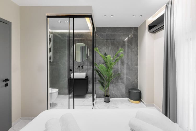 Τα δύο υπνοδωμάτια είναι διακοσμημένα με ποιοτικά λευκά είδη, άφθονο αποθηκευτικό χώρο και κλιματισμό σε κάθε δωμάτιο. Το ένα υπνοδωμάτιο διαθέτει en-suite μπάνιο, ενώ το master μπάνιο προσφέρει καινοτόμο έξυπνο γυαλί ιδιωτικότητας για μια πινελιά πολυτέλειας. Πλυντήριο ρούχων και γρήγορο Wi-Fi κάνουν τη διαμονή σας ακόμα πιο άνετη, ακόμη και για μεγαλύτερες περιόδους.