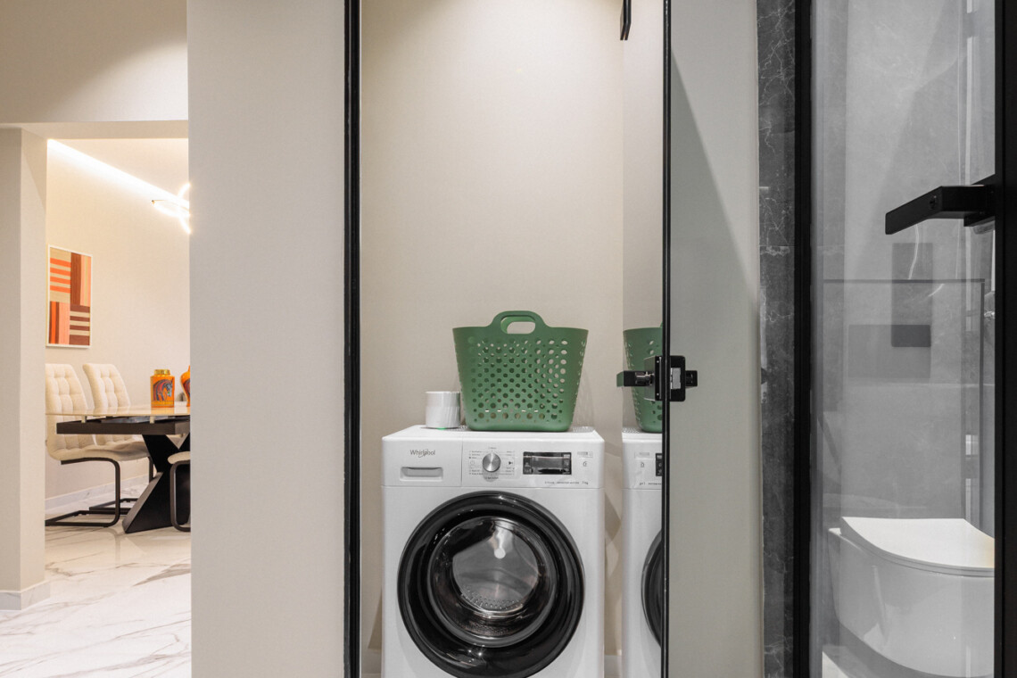 Τα δύο υπνοδωμάτια είναι διακοσμημένα με ποιοτικά λευκά είδη, άφθονο αποθηκευτικό χώρο και κλιματισμό σε κάθε δωμάτιο. Το ένα υπνοδωμάτιο διαθέτει en-suite μπάνιο, ενώ το master μπάνιο προσφέρει καινοτόμο έξυπνο γυαλί ιδιωτικότητας για μια πινελιά πολυτέλειας. Πλυντήριο ρούχων και γρήγορο Wi-Fi κάνουν τη διαμονή σας ακόμα πιο άνετη, ακόμη και για μεγαλύτερες περιόδους.