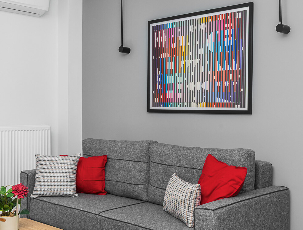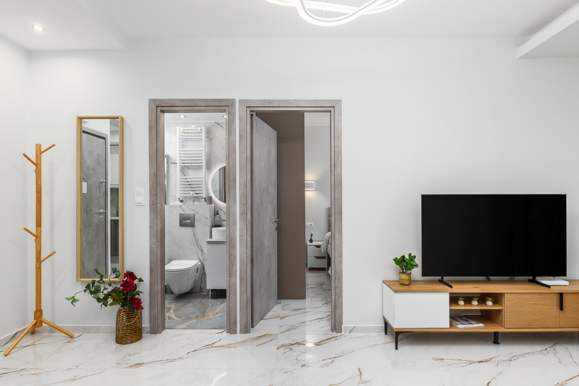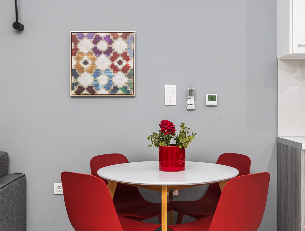 Το Eleanor διαθέτει ένα φωτεινό και κομψά επιπλωμένο καθιστικό με Smart TV, μοντέρνα διακόσμηση και έναν άνετο καναπέ, ιδανικό για στιγμές χαλάρωσης ή για να απολαύσετε μια βραδιά ταινίας. Ο ανοιχτός χώρος ενώνεται αρμονικά με την τραπεζαρία, όπου ένα μοντέρνο τραπέζι με τέσσερις ζωηρές κόκκινες καρέκλες δημιουργεί έναν φιλόξενο χώρο για γεύματα και συγκεντρώσεις.