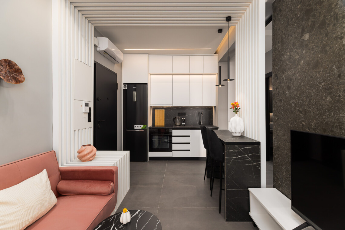 Στο καθιστικό, οι επισκέπτες θα βρουν μια ζεστή γωνιά με κομψό καναπέ που μετατρέπεται σε κρεβάτι για τρίτο άτομο. Ο χώρος είναι προσεκτικά διαμορφωμένος ώστε να αποπνέει αίσθηση ανοιχτότητας αλλά και οικειότητας, ιδανικός για χαλάρωση, διάβασμα ή μια ήρεμη βραδιά. Το φυσικό φως πλημμυρίζει το διαμέρισμα μέσα από τα μεγάλα παράθυρα, ενώ η διακόσμηση αντικατοπτρίζει τη σύγχρονη, αστική αισθητική της halu, με φυσικά υλικά και απαλούς τόνους.