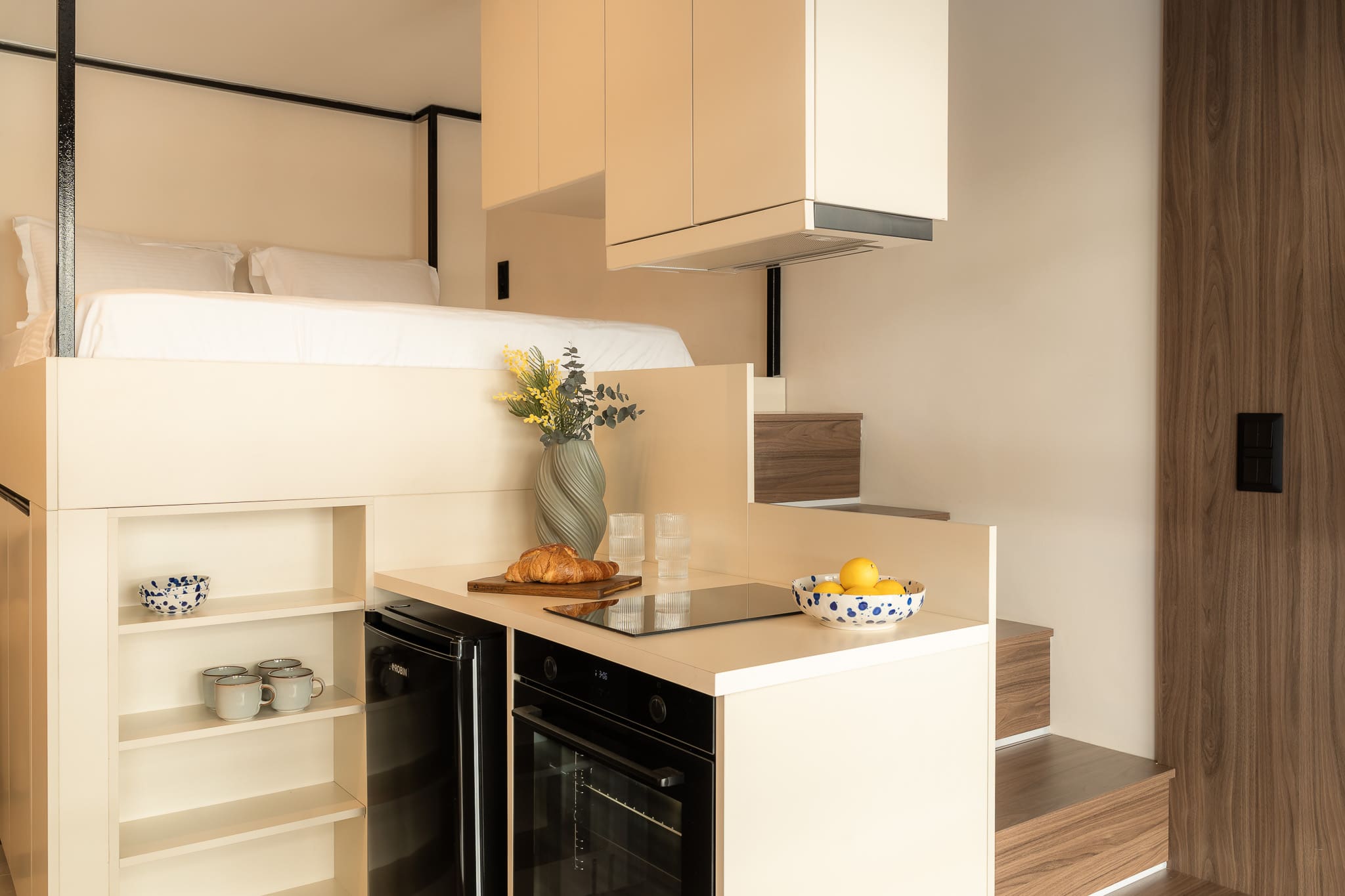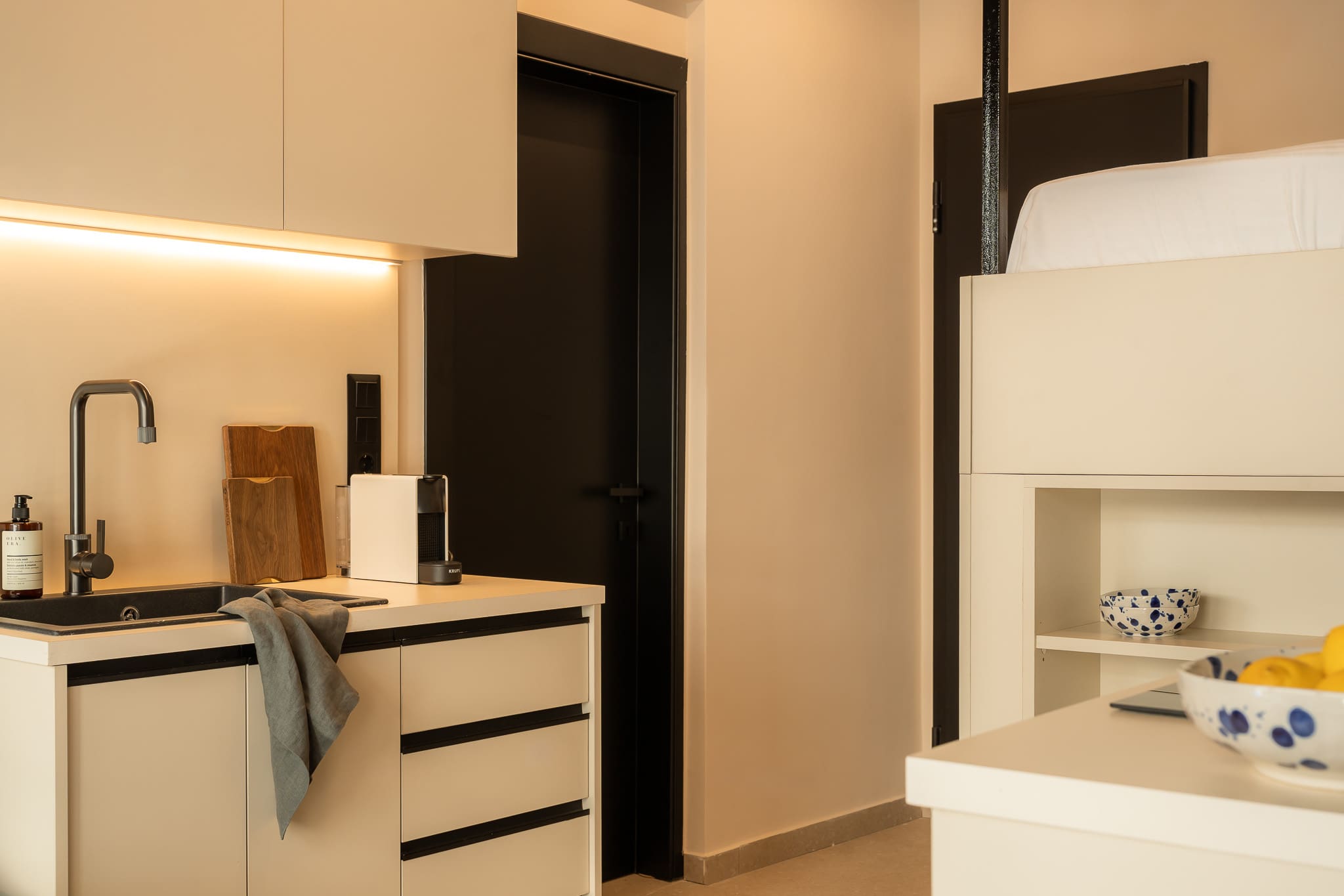 Η μικρή κουζίνα είναι πλήρως εξοπλισμένη με εστίες, ψυγείο, καφετιέρα και όλα τα βασικά σκεύη για την προετοιμασία γευμάτων ή σνακ. Είτε θέλετε να απολαύσετε ένα ήσυχο πρωινό είτε να ετοιμάσετε ένα ελαφρύ δείπνο, θα βρείτε τα πάντα στη διάθεσή σας.