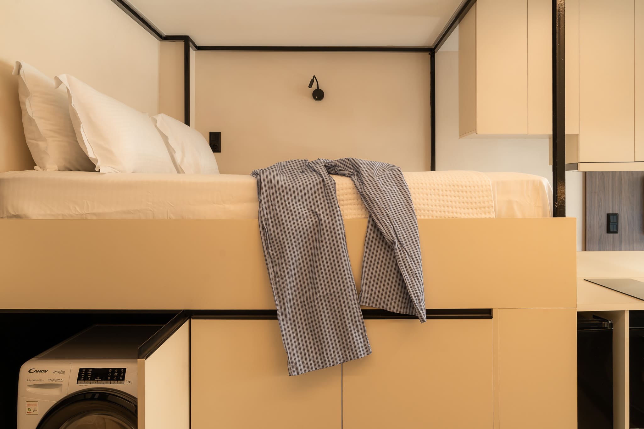 Ο χώρος ύπνου περιλαμβάνει ένα άνετο διπλό κρεβάτι με απαλές λευκές πετσέτες και θερμό φωτισμό που δημιουργεί μια χαλαρωτική και οικεία ατμόσφαιρα. Δίπλα βρίσκεται ένας σύγχρονος καναπές που μετατρέπεται εύκολα σε κρεβάτι, καθιστώντας το στούντιο κατάλληλο για έως τρία άτομα. Η διάταξη του χώρου έχει σχεδιαστεί με προσοχή ώστε να μεγιστοποιεί την άνεση χωρίς να θυσιάζει το στυλ.