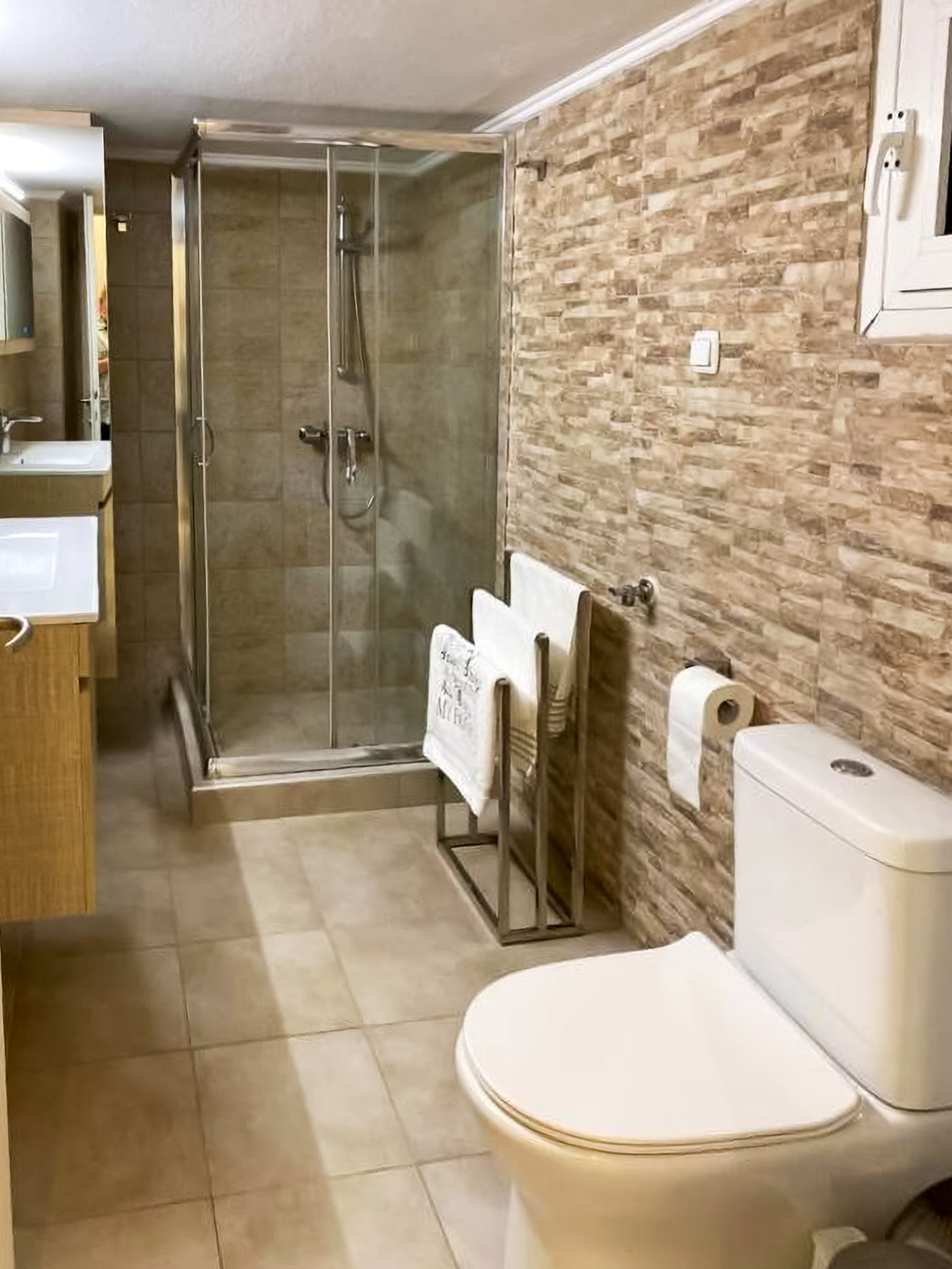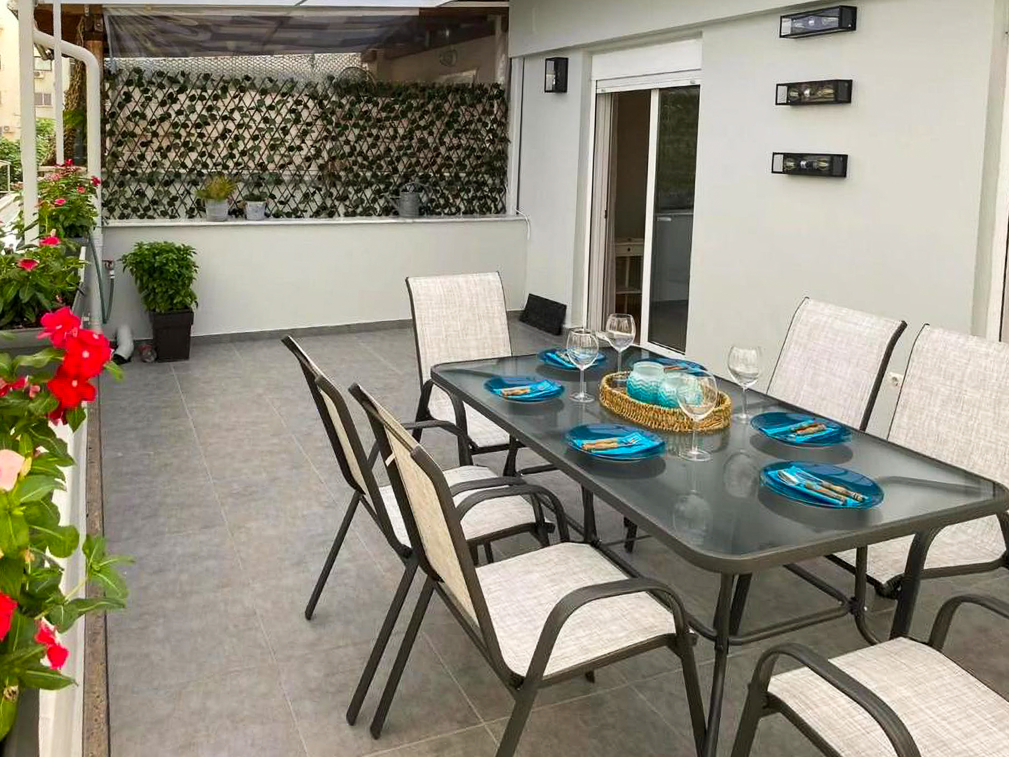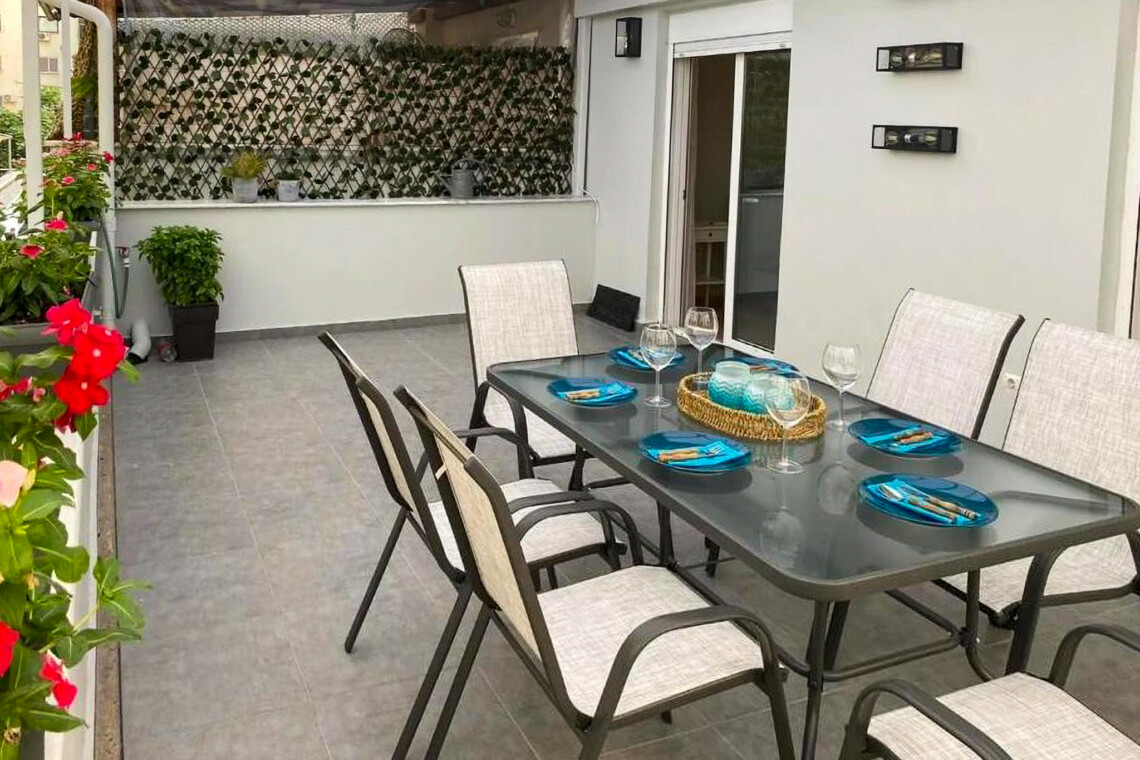 Grace has a bright open plan living and dining area with modern furnishings, a flat screen TV, and large openings that fill the home with natural light. The private kitchen is fully equipped for short or extended stays, with modern appliances, ample storage, and a washing machine discreetly integrated into the space. The apartment includes two comfortable queen bedrooms designed for rest and privacy, plus a third bedroom with a twin bed and a desk, ideal for guests who need a dedicated workspace. A key advantage is the two modern bathrooms, so everyone can get ready comfortably, even when you are traveling as a group. Both bathrooms offer walk in showers, quality finishes, fresh towels, and everyday essentials. Air conditioning, heating, free WiFi, and generous wardrobe space ensure a comfortable stay all year. Outside, you can enjoy a furnished private terrace for dining or relaxing, and an additional balcony with a city view.