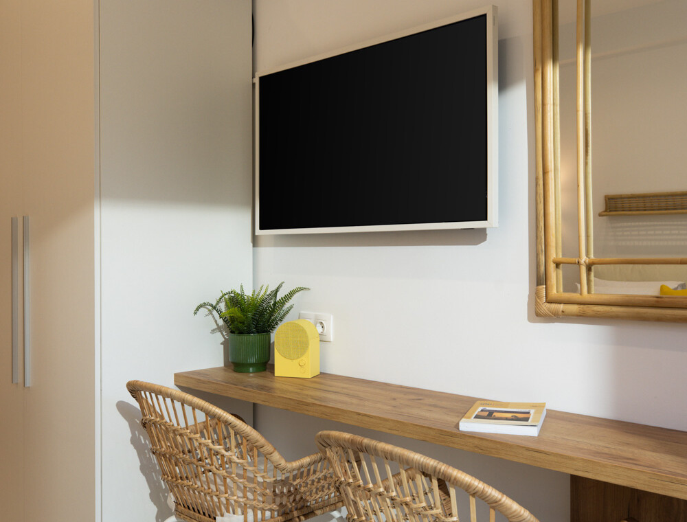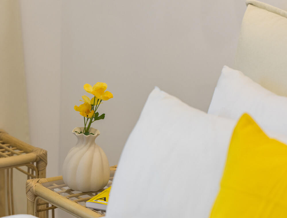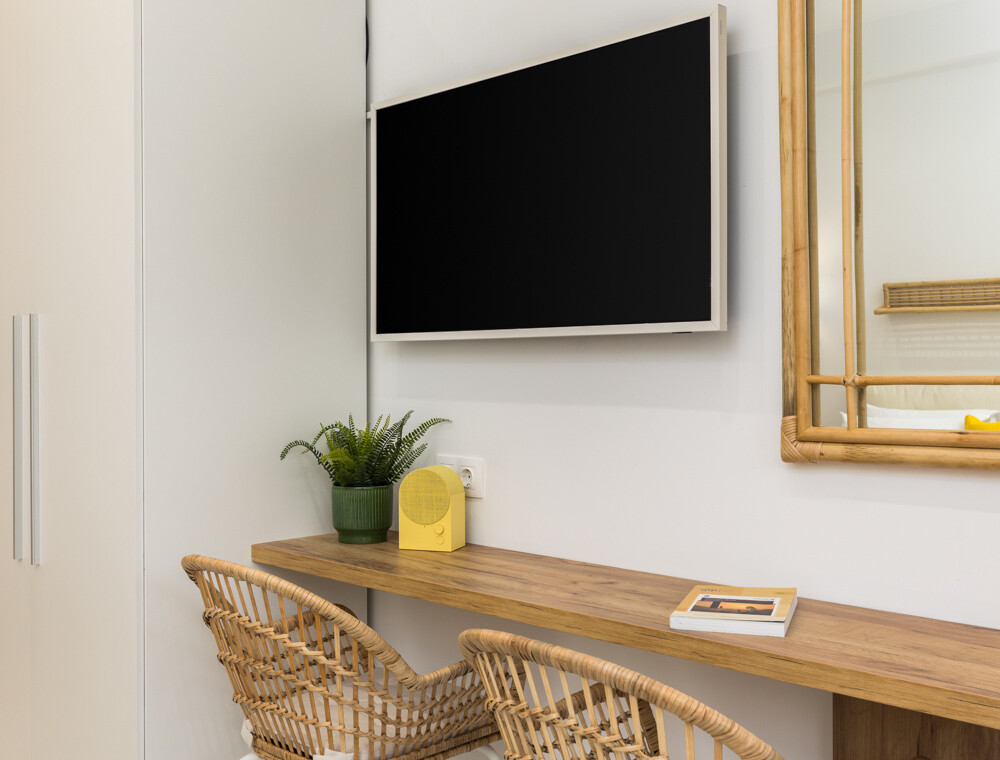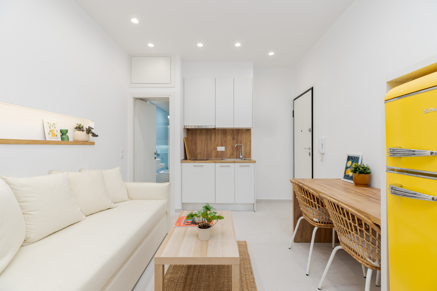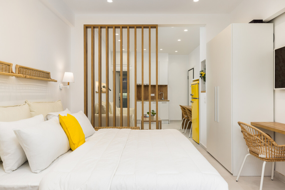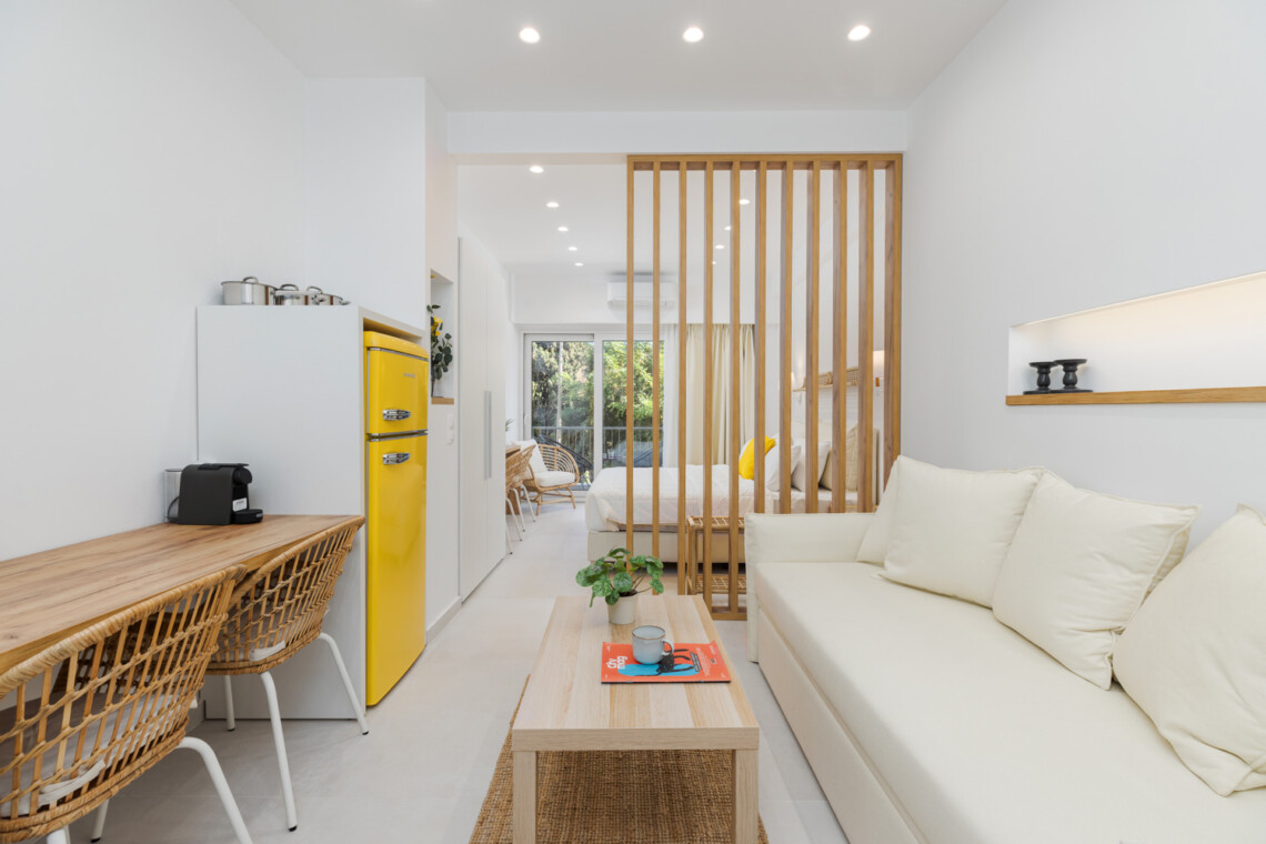 Η ανοιχτή του διαρρύθμιση περιλαμβάνει ένα άνετο διπλό κρεβάτι (queen-size), έναν φωτεινό χώρο καθιστικού με καναπέ και μια πλήρως εξοπλισμένη κουζίνα με χαρακτηριστικό κίτρινο ρετρό ψυγείο, μηχανή Nespresso, βραστήρα και τραπεζαρία. Φυσικά υλικά, απαλός φωτισμός και ουδέτερες αποχρώσεις δημιουργούν ένα χαλαρωτικό περιβάλλον, ενώ οι κίτρινες πινελιές προσθέτουν μια παιχνιδιάρικη μεσογειακή νότα. Οι επισκέπτες μπορούν να απολαύσουν το ιδιωτικό μπαλκόνι με θέα στον ζωντανό δρόμο της πόλης — ιδανικό για πρωινό καφέ ή ένα ποτό το βράδυ.