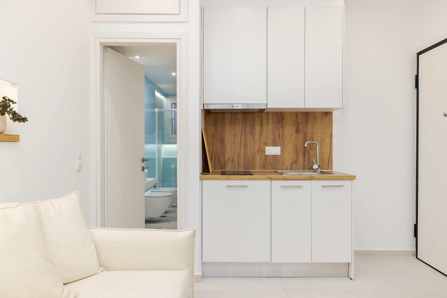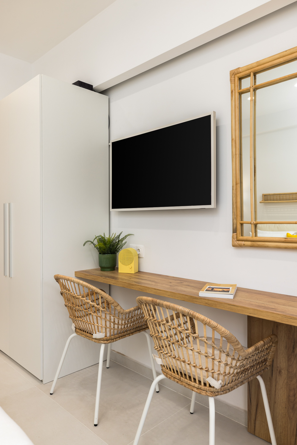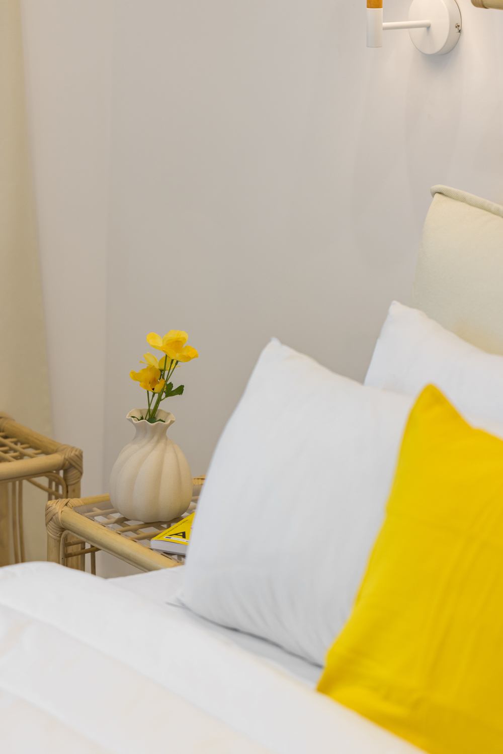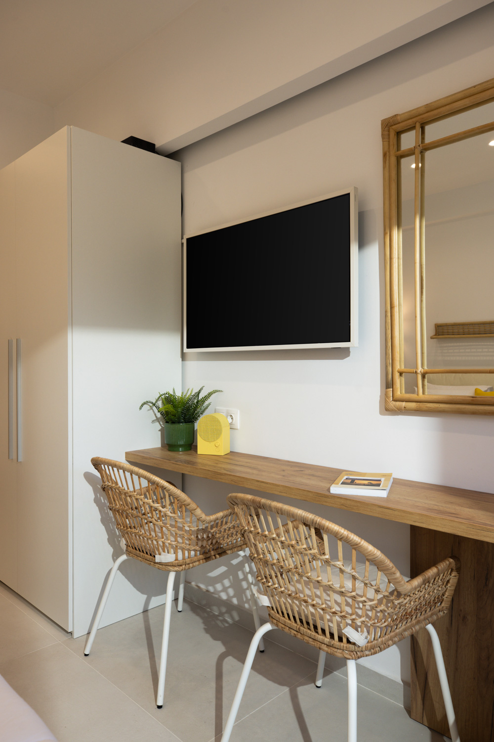 Η ανοιχτή του διαρρύθμιση περιλαμβάνει ένα άνετο διπλό κρεβάτι (queen-size), έναν φωτεινό χώρο καθιστικού με καναπέ και μια πλήρως εξοπλισμένη κουζίνα με χαρακτηριστικό κίτρινο ρετρό ψυγείο, μηχανή Nespresso, βραστήρα και τραπεζαρία. Φυσικά υλικά, απαλός φωτισμός και ουδέτερες αποχρώσεις δημιουργούν ένα χαλαρωτικό περιβάλλον, ενώ οι κίτρινες πινελιές προσθέτουν μια παιχνιδιάρικη μεσογειακή νότα. Οι επισκέπτες μπορούν να απολαύσουν το ιδιωτικό μπαλκόνι με θέα στον ζωντανό δρόμο της πόλης — ιδανικό για πρωινό καφέ ή ένα ποτό το βράδυ.