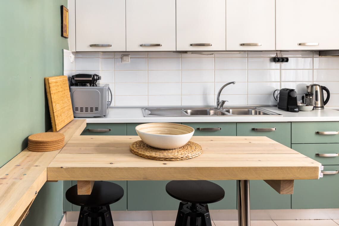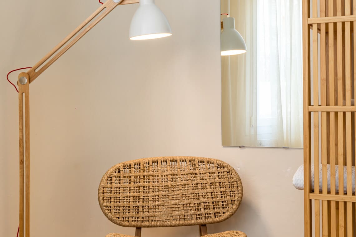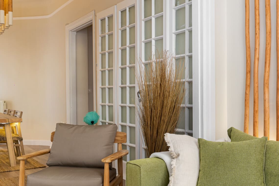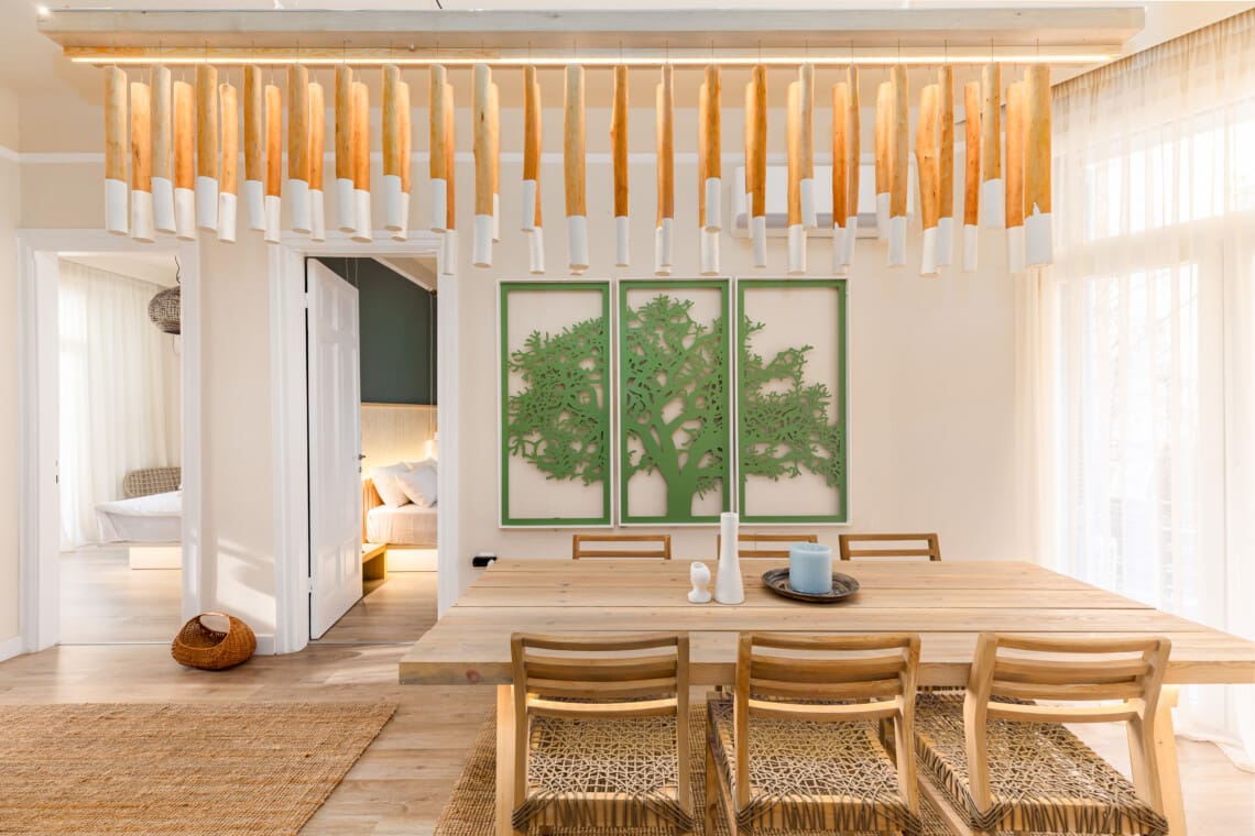 The residence flaunts three cozy bedrooms, each adorned with comfortable queen-size beds guaranteeing you a tranquil night’s sleep. Unwind after a day of exploring in our spacious living room, characterized by its earthy elements and unique decorative pieces made of homemade wood and bamboo, lending a calming and nature-centric atmosphere. A multipurpose dining area adjacent to the living room also doubles up as an effective workspace for up to 6 people, catering to your every need.