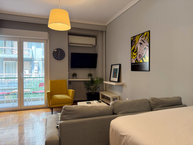 Καλώς ήρθατε στο Miró, ένα φωτεινό και καλλιτεχνικό διαμέρισμα στον πρώτο όροφο, στην καρδιά της Θεσσαλονίκης. Το διαμέρισμα προσφέρει ένα άνετο υπνοδωμάτιο με διπλό κρεβάτι και σαλόνι με δεύτερο κρεβάτι, ώστε να καλύπτει τις ανάγκες οικογενειών, φίλων ή συναδέλφων που ταξιδεύουν μαζί.