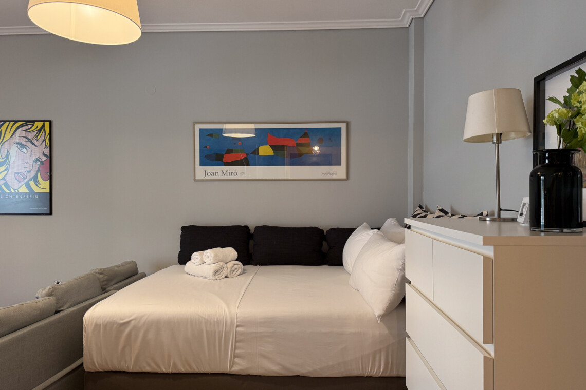 Το μπαλκόνι του διαμερίσματος είναι πλήρως επιπλωμένο και προσφέρει θέα στη ζωντανή γειτονιά. Εδώ μπορείτε να απολαύσετε τον καφέ σας το πρωί ή ένα ποτήρι κρασί το βράδυ. Με 65 τετραγωνικά μέτρα, το Miró προσφέρει τον τέλειο συνδυασμό άνεσης και λειτουργικότητας, ιδανικό τόσο για σύντομες αποδράσεις όσο και για παρατεταμένες διαμονές.