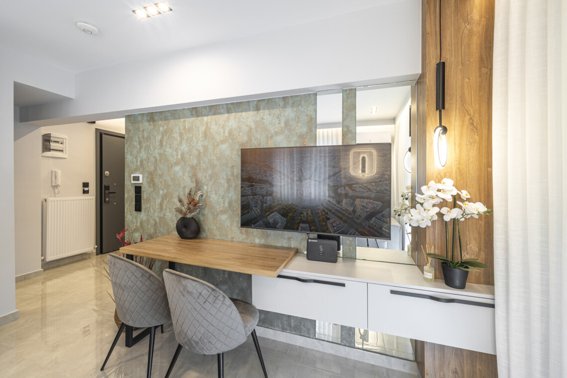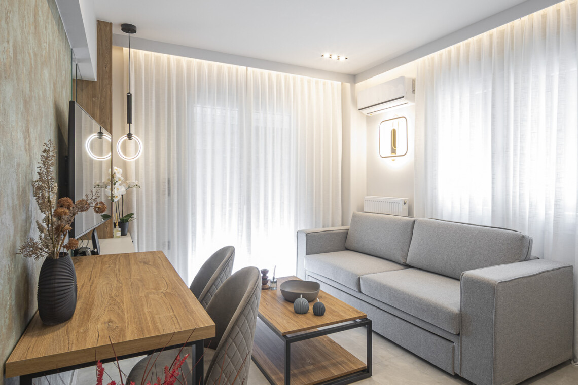 Το φωτεινό και φιλόξενο σαλόνι διαθέτει άνετο καναπέ-κρεβάτι που μπορεί εύκολα να φιλοξενήσει επιπλέον επισκέπτες. Απολαύστε τις αγαπημένες σας σειρές στην smart TV ή αξιοποιήστε τον ειδικά διαμορφωμένο χώρο εργασίας, ιδανικό για τηλεργασία ή για να οργανώσετε τις εκδρομές σας. Τα μεγάλα παράθυρα πλημμυρίζουν τον χώρο με φυσικό φως κατά τη διάρκεια της ημέρας, ενώ οι διακριτικές κουρτίνες δημιουργούν μια χαλαρωτική ατμόσφαιρα.