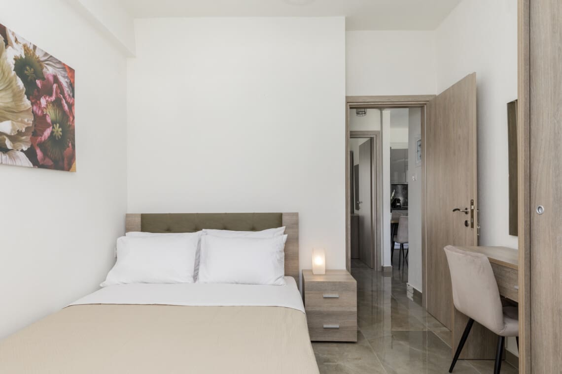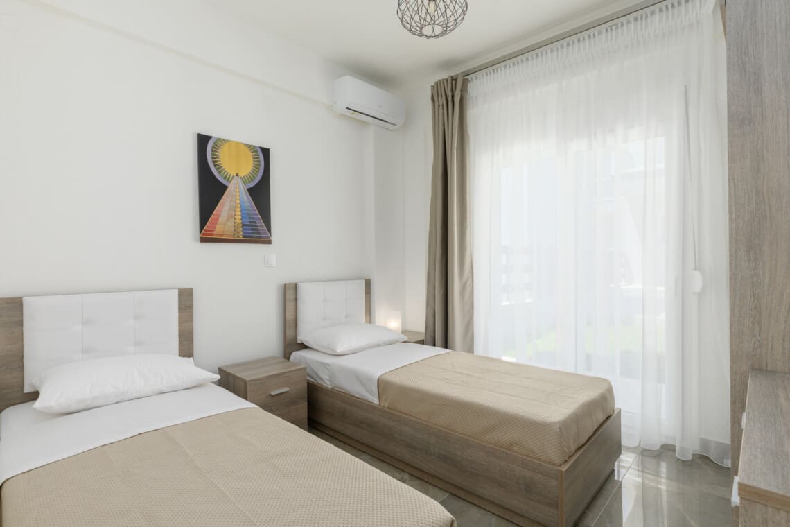 Nestled in the heart of Nikiti, our Miami apartment boasts 2 well-appointed bedrooms to ensure a restful night’s sleep for everyone. The master bedroom features a comfy queen-size bed, ideal for unwinding after a day of adventure, while the second bedroom has single beds, perfect for kids or friends sharing. Fresh and clean linens await you, ensuring a peaceful slumber.