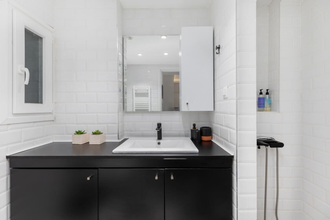 The apartment also includes a modern bathroom with a shower, stocked with fresh towels and essential toiletries, ensuring a hassle-free stay.