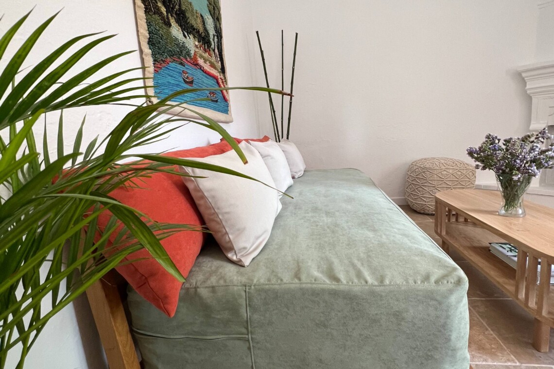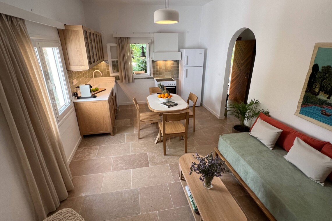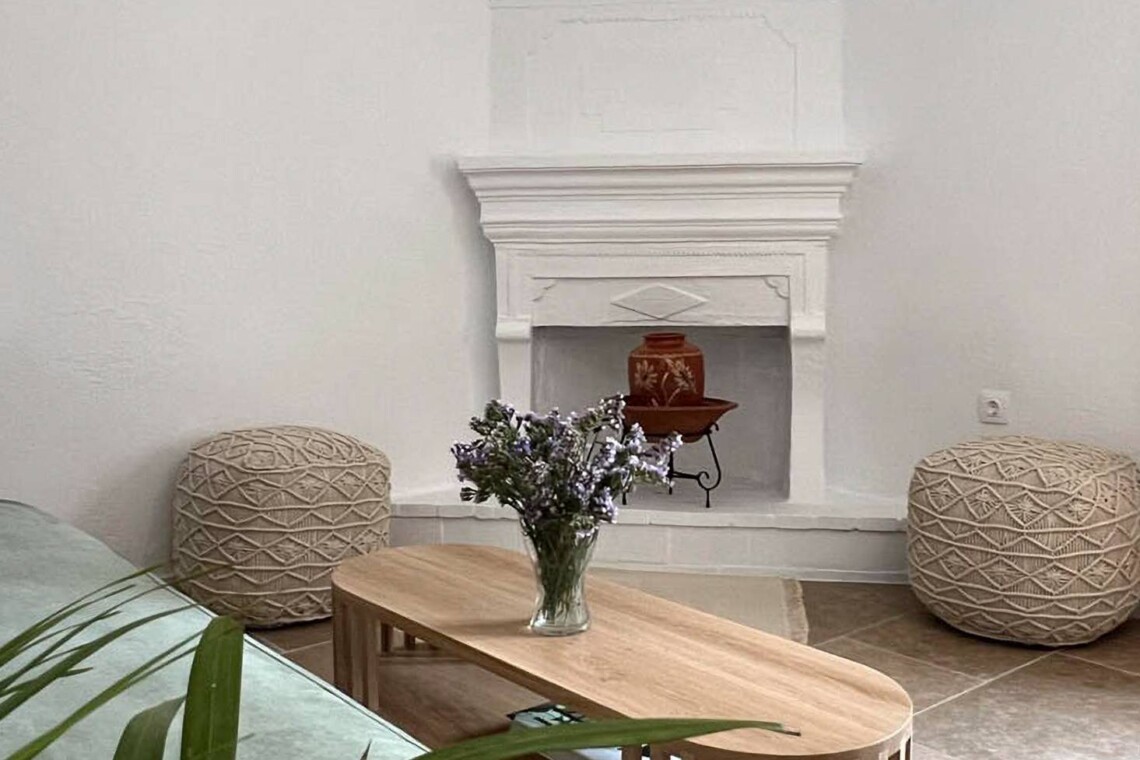 Στο εσωτερικό του Sycamore House, φυσικά υλικά και καθαρές γραμμές δημιουργούν μια ήρεμη, φιλόξενη ατμόσφαιρα. Το σαλόνι διαθέτει χειροποίητα ξύλινα έπιπλα, άνετους καναπέδες σε απαλό φασκόμηλο πράσινο και ένα κεντρικό τζάκι που προσθέτει ζεστασιά και χαρακτήρα. Το δάπεδο από κεραμικά πλακάκια σε γήινες αποχρώσεις και λεπτομέρειες όπως τοπικά έργα τέχνης και φρέσκα φυτά προσδίδουν στυλ και αίσθηση γείωσης σε όλο τον χώρο.