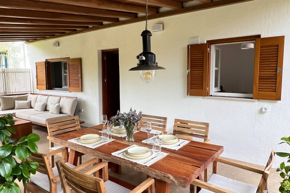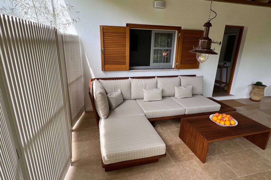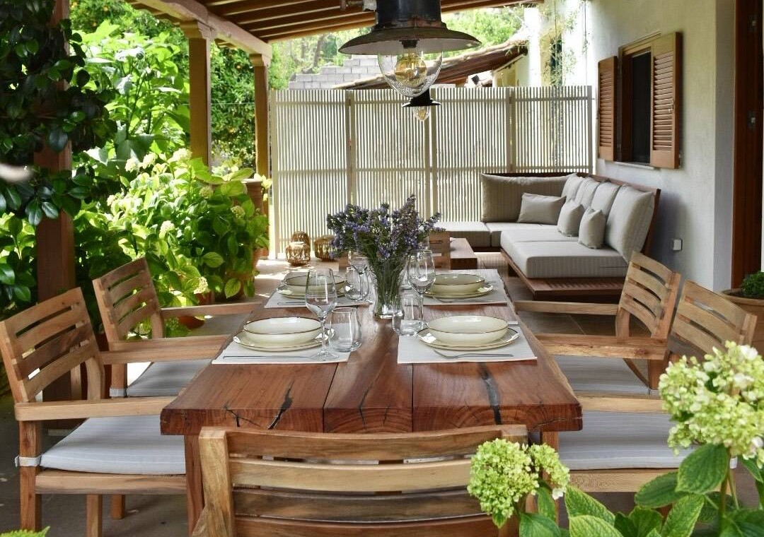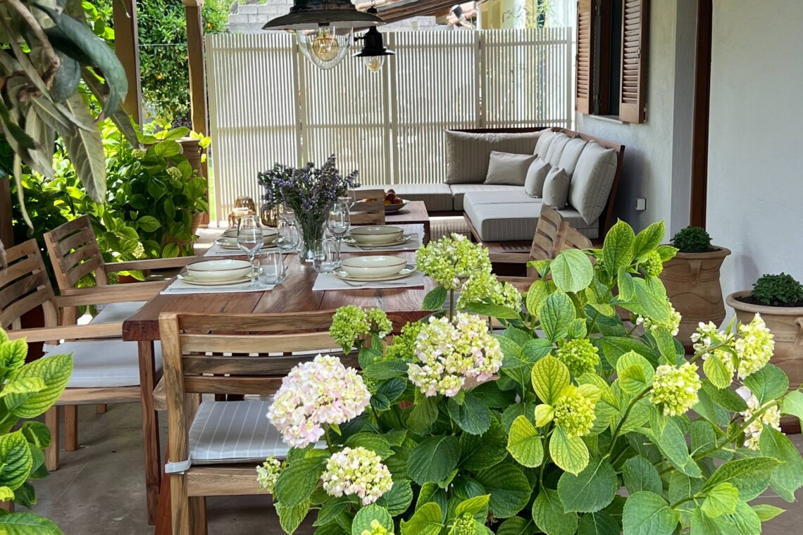 Βγείτε έξω στη μεγάλη σκεπαστή βεράντα, που πλαισιώνεται από ώριμα δέντρα και καταπράσινα παρτέρια. Το τραπέζι φαγητού είναι ιδανικό για καλοκαιρινά γεύματα, ενώ ο εξωτερικός καναπές σας προσκαλεί να χαλαρώσετε με ένα βιβλίο ή να απολαύσετε το βράδυ κάτω από τα αστέρια. Πέτρινα μονοπάτια, γλάστρες και αρωματική λεβάντα συμπληρώνουν την αίσθηση της γαλήνιας εξοχής.
