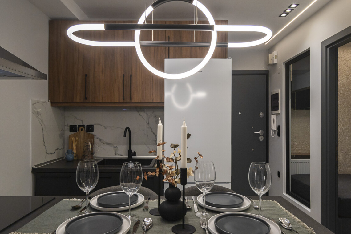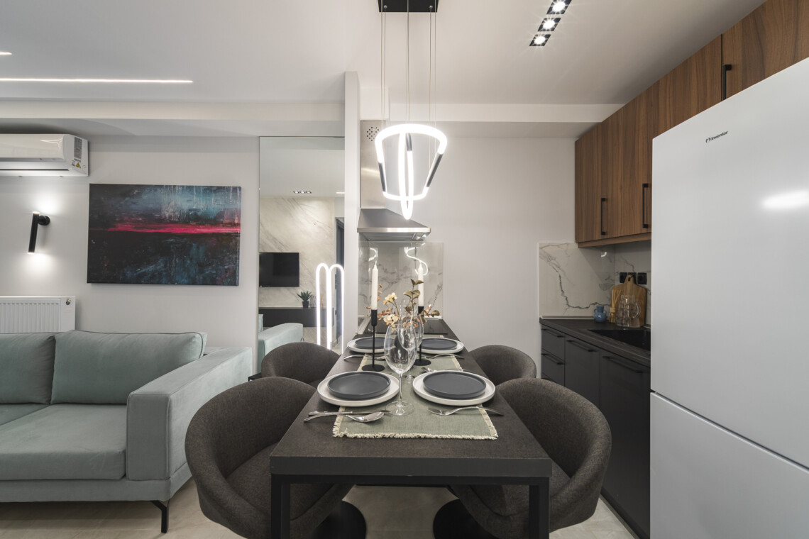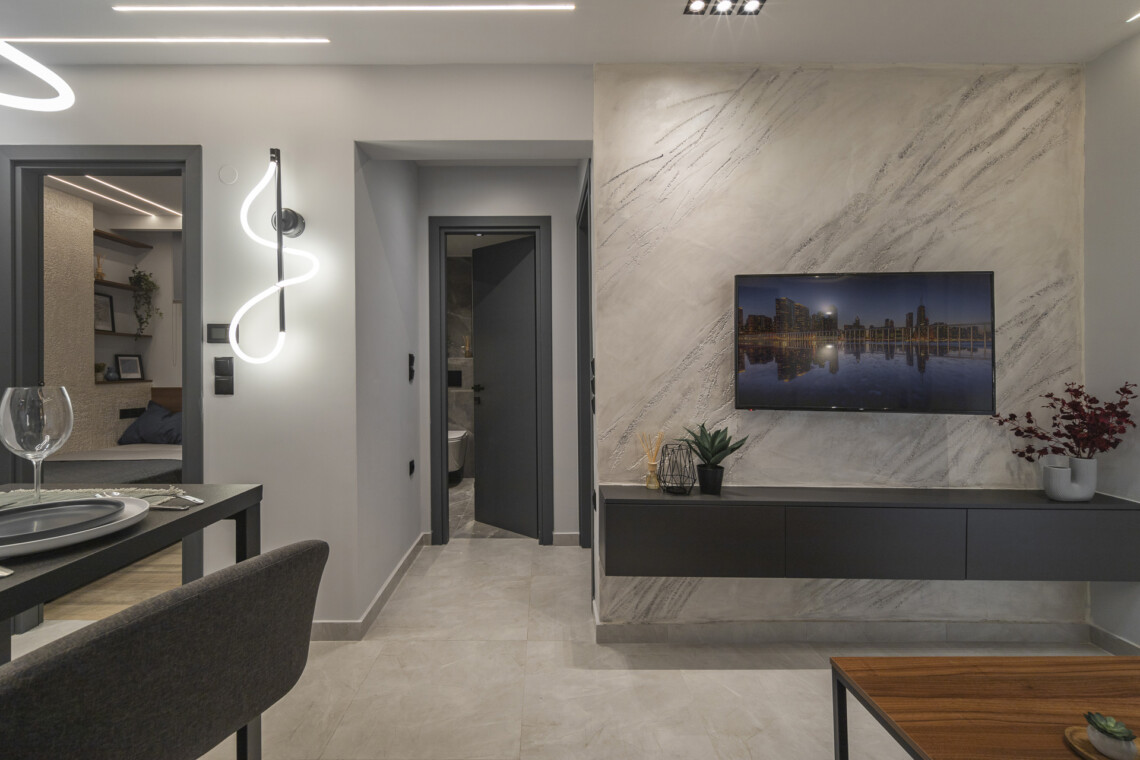 Ο εσωτερικός χώρος είναι προσεκτικά επιμελημένος με σύγχρονη διακόσμηση, απαλό φωτισμό και custom λεπτομέρειες. Το ενιαίο σαλόνι είναι ιδανικό για χαλάρωση μετά από μια μέρα εξερεύνησης, με έναν άνετο καναπέ και Smart TV. Η πλήρως εξοπλισμένη κουζίνα έχει όλα όσα χρειάζεστε για να ετοιμάσετε ένα γεύμα ή να απολαύσετε τον καφέ σας στη μοντέρνα τραπεζαρία.