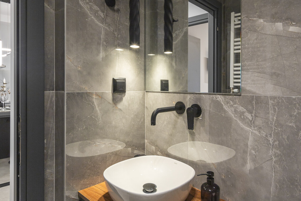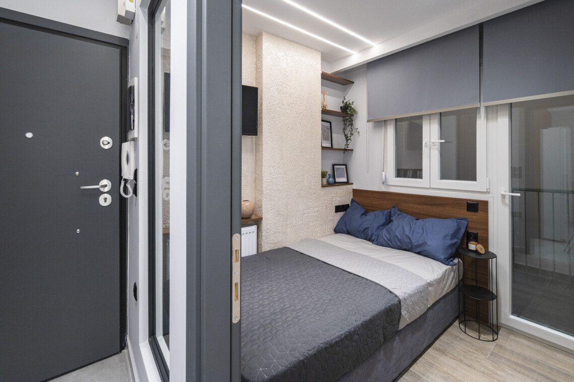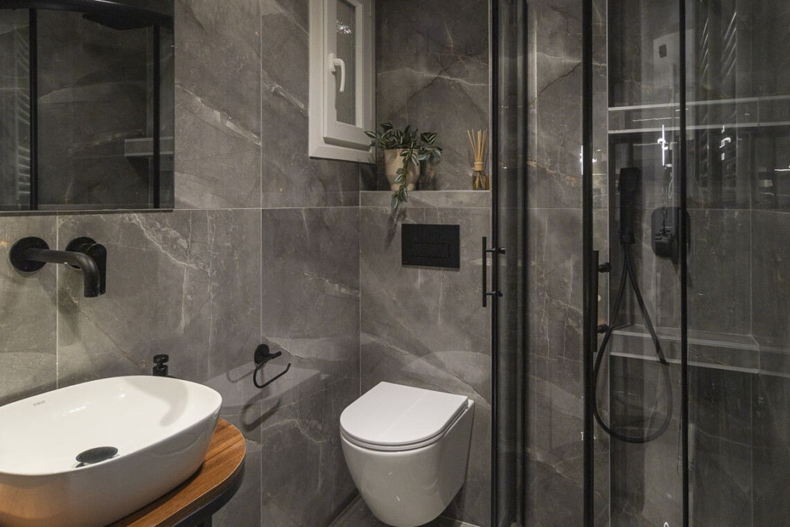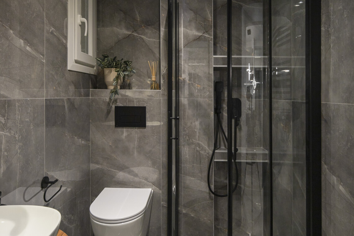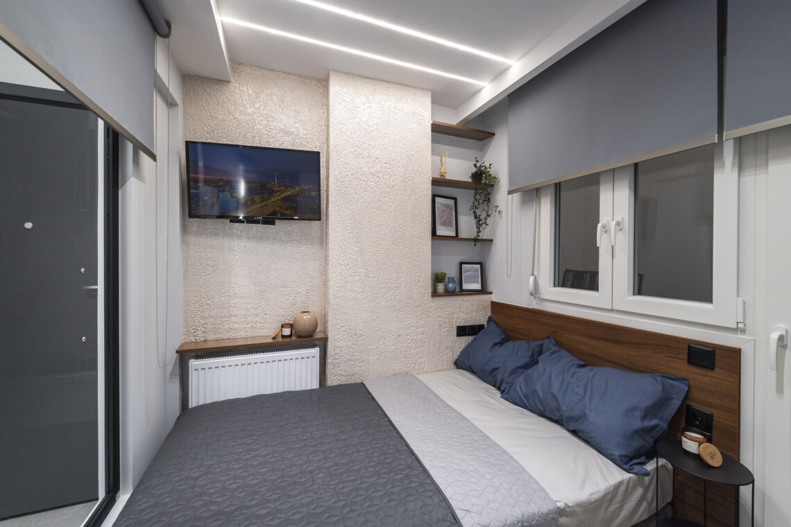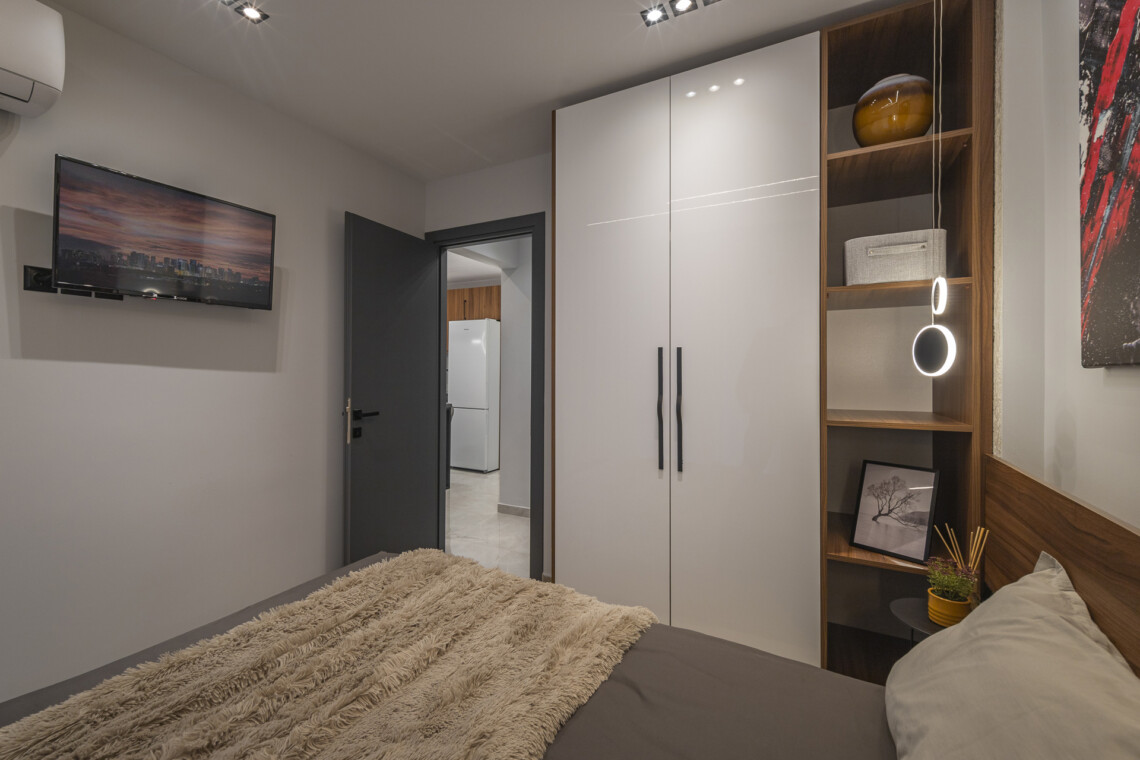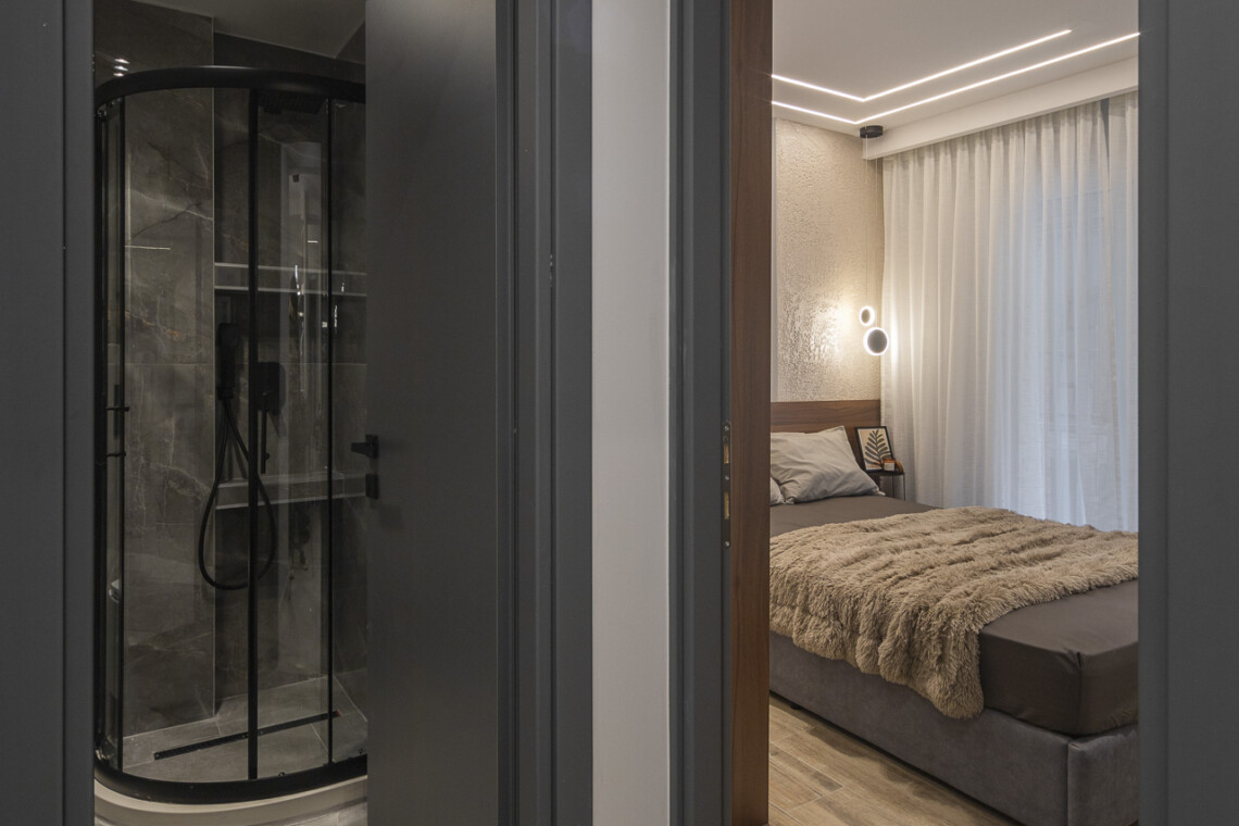 Και τα δύο υπνοδωμάτια διαθέτουν ποιοτικά στρώματα, μαλακά σεντόνια και εντοιχισμένες ντουλάπες, δημιουργώντας μια ήρεμη και χαλαρωτική ατμόσφαιρα. Το σύγχρονο μπάνιο προσφέρει walk-in ντους με βροχή και μαύρες λεπτομέρειες για μια αίσθηση πολυτέλειας.