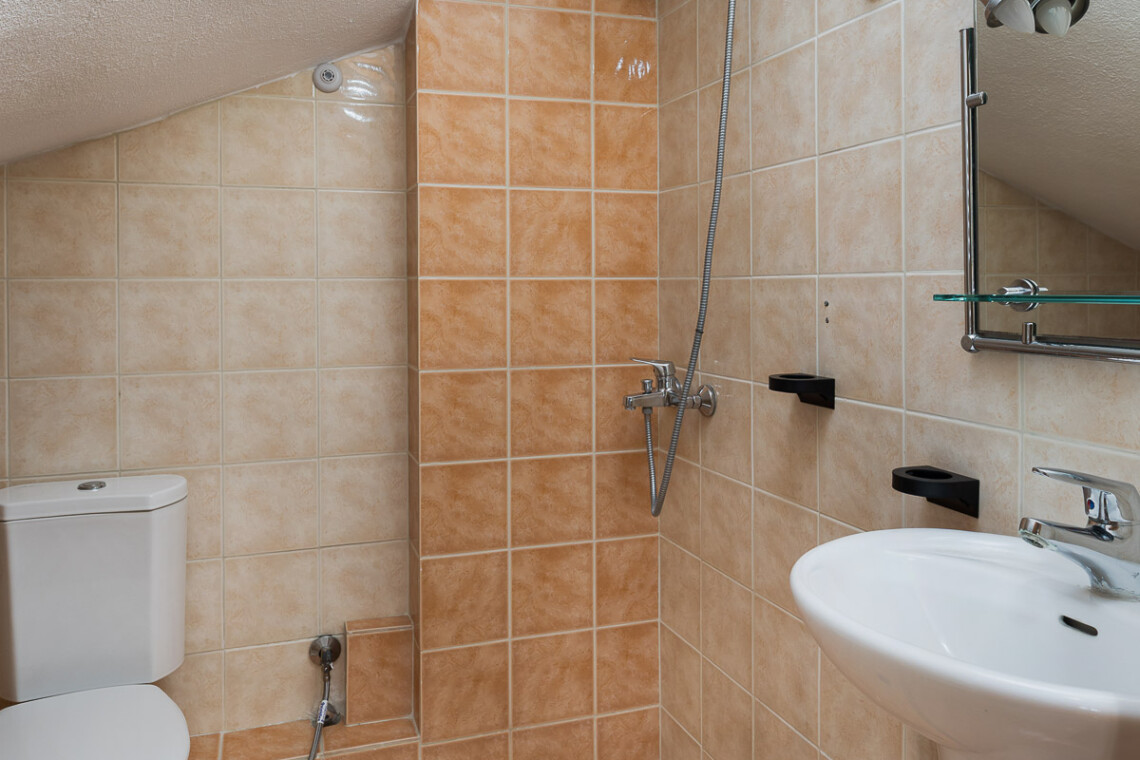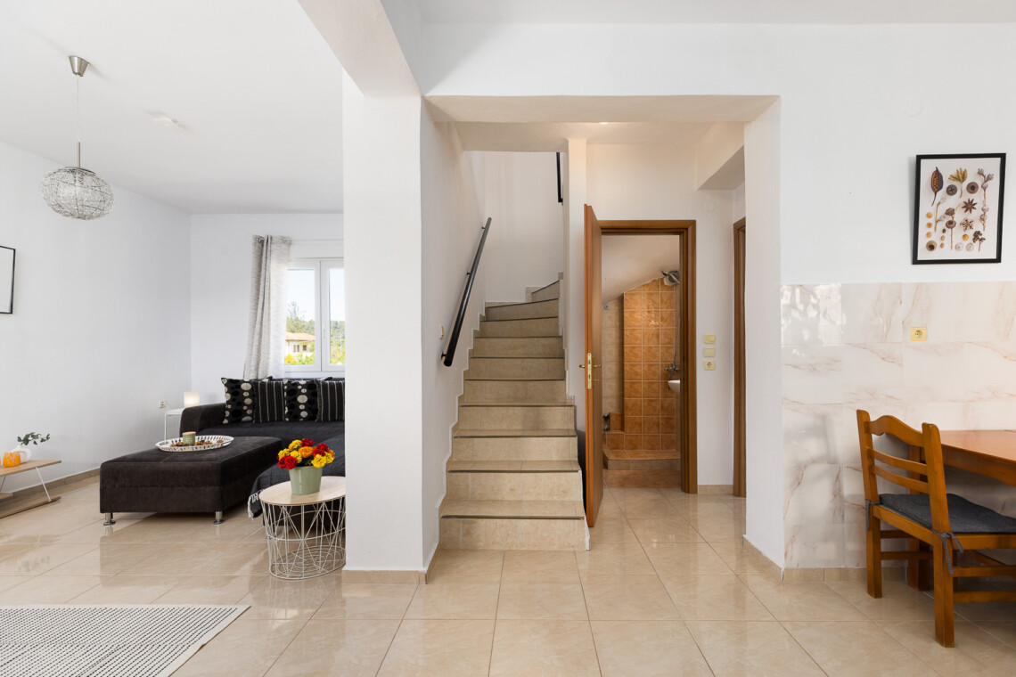 Στον επάνω όροφο υπάρχουν δύο υπνοδωμάτια με κρεβάτια queen-size και ένα με δύο μονά, όλα εξοπλισμένα με ανεμιστήρες οροφής για δροσερές και άνετες νύχτες. Ένα δεύτερο μπάνιο με μπανιέρα προσθέτει επιπλέον πρακτικότητα.