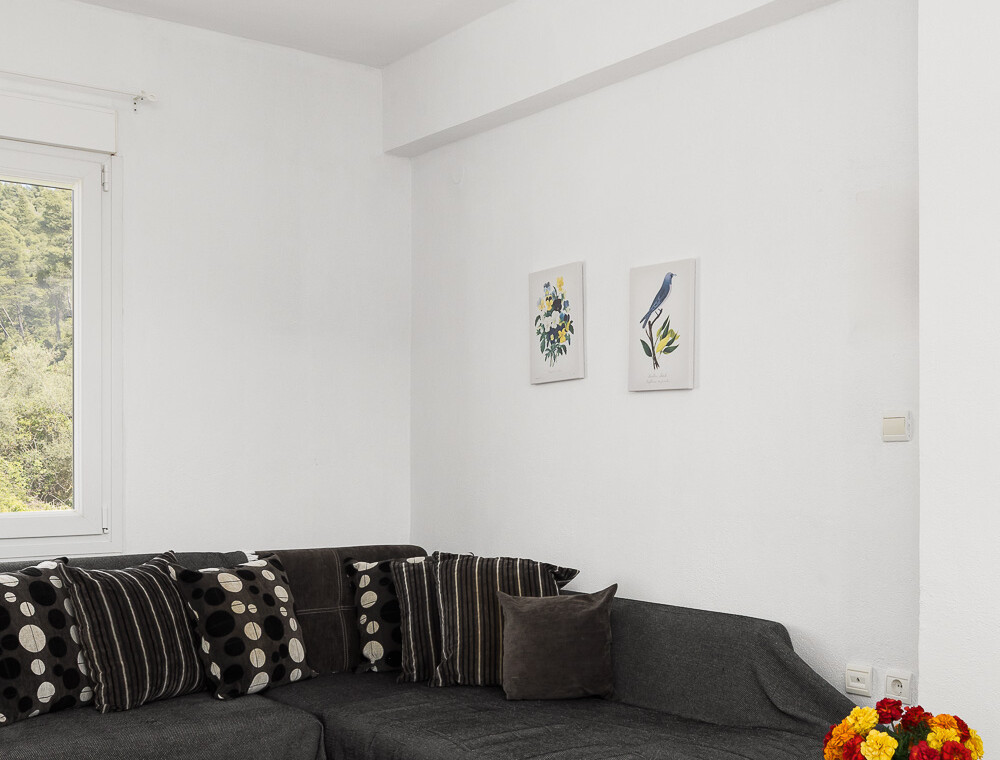 Με αισθητική που συνδυάζει τη μινιμαλιστική απλότητα με ζεστές πινελιές, η βίλα των 120 τ.μ. διαθέτει τέσσερα υπνοδωμάτια και δύο μπάνια, αποτελώντας ιδανική επιλογή για οικογένειες ή παρέες φίλων. Το υπερυψωμένο ισόγειο περιλαμβάνει ένα άνετο καθιστικό με αναπαυτικούς καναπέδες, τηλεόραση 50”, κλιματισμό και τζάκι – τον ιδανικό χώρο για στιγμές χαλάρωσης. Η πλήρως εξοπλισμένη κουζίνα διαθέτει ηλεκτρικό φούρνο, εστίες, ψυγείο, καφετιέρα φίλτρου, βραστήρα, τοστιέρα και όλα τα απαραίτητα σκεύη, ενώ η τραπεζαρία προσφέρεται για κοινά γεύματα. Η ιδιωτική βεράντα με τραπέζι για έξι άτομα προσφέρει ένα ήσυχο σκηνικό με θέα στη φύση. Σε αυτό το επίπεδο θα βρείτε επίσης ένα υπνοδωμάτιο με διπλό κρεβάτι και ανεμιστήρα οροφής, καθώς και ένα μπάνιο με ντουζιέρα.