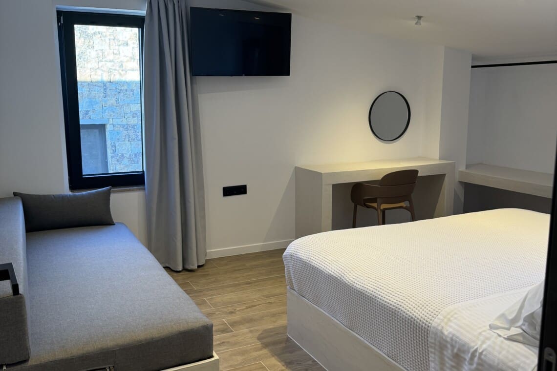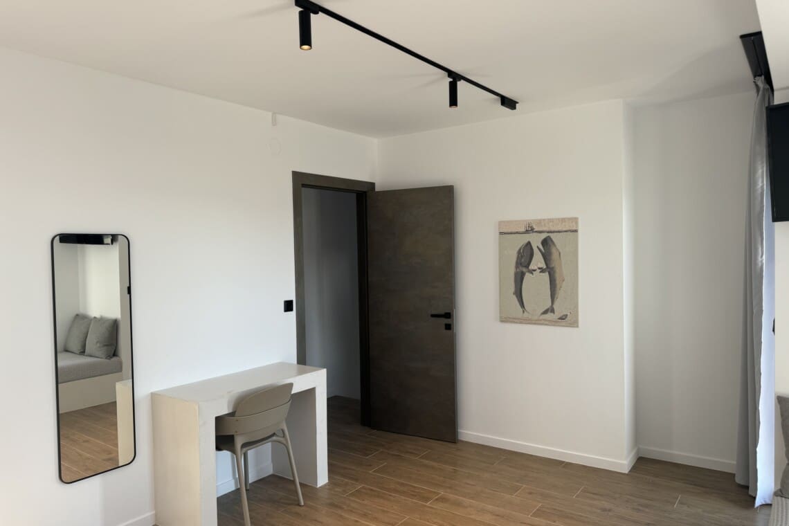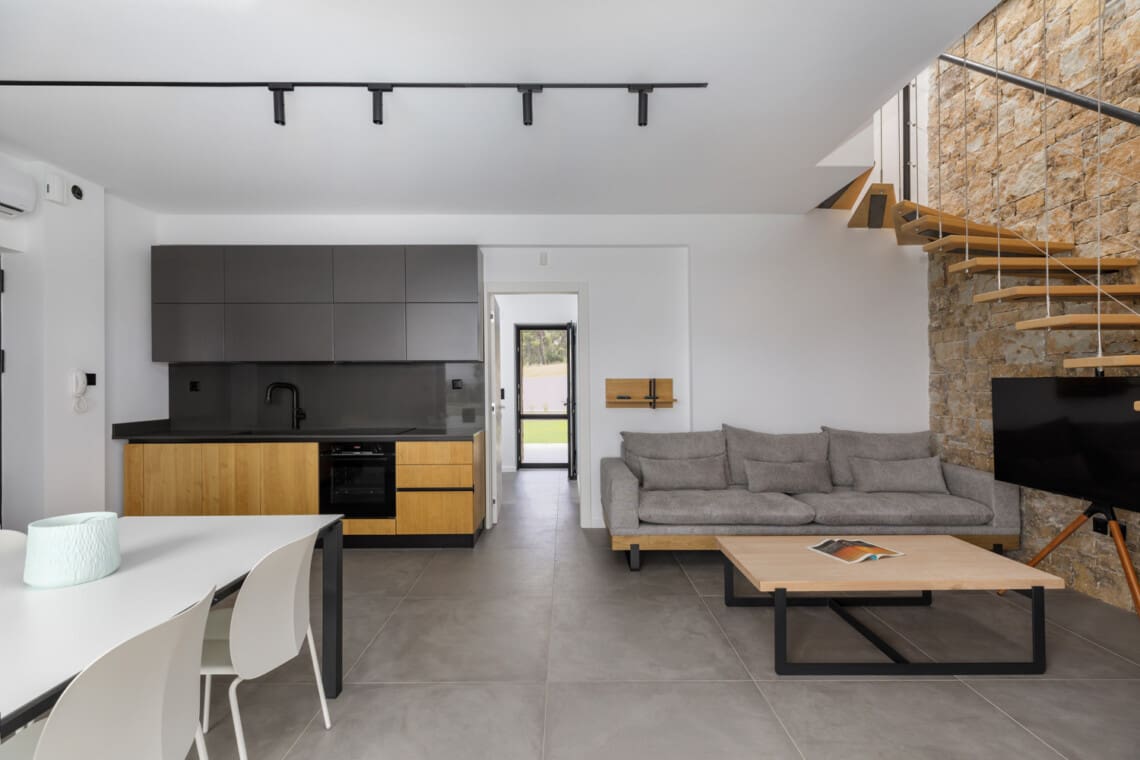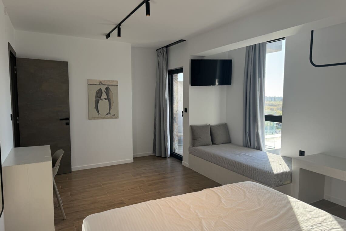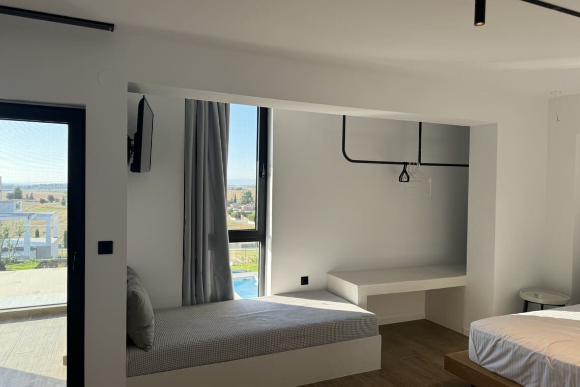 Μπείτε στο ευρύχωρο σαλόνι, όπου τα μεγάλα παράθυρα πλημμυρίζουν το χώρο με φυσικό φως, δημιουργώντας μια ζεστή και φιλόξενη ατμόσφαιρα. Εδώ, μπορείτε να χαλαρώσετε σε άνετα καθίσματα, ιδανικά για να απολαύσετε χαλαρά πρωινά ή ζεστά βράδια μαζί.