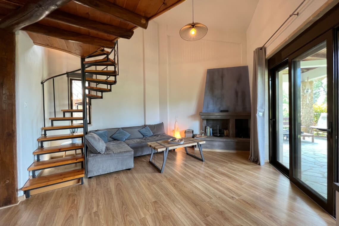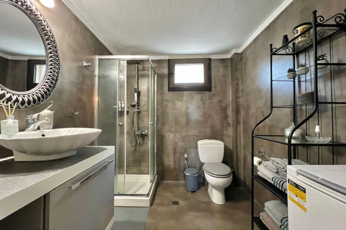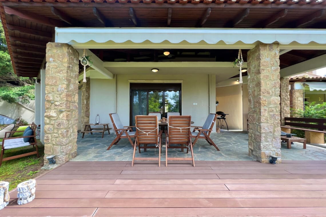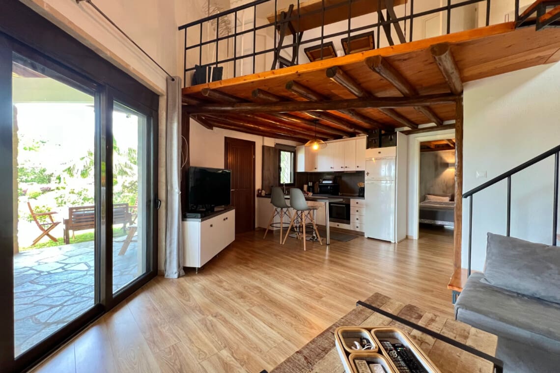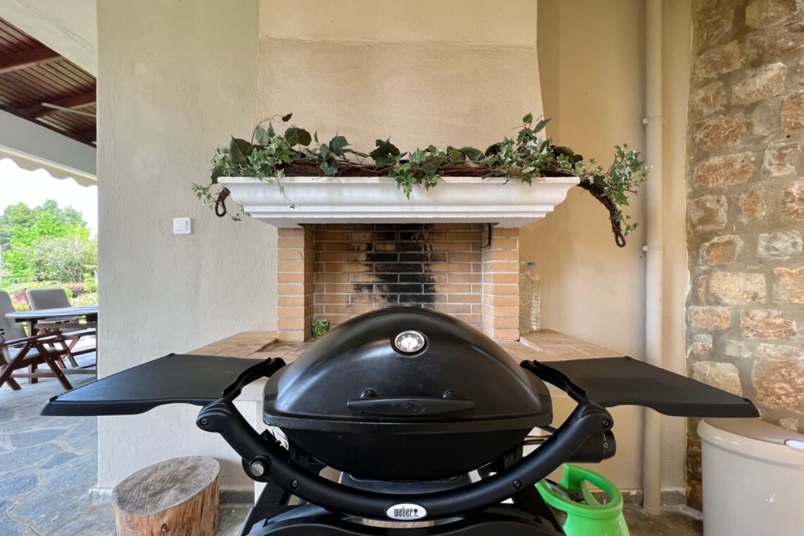 But there’s more! Dive into relaxation in not one, but two spacious living rooms, with the second perched on the upper floor, providing a perfect nook for reading, playing, or simply enjoying the serene views. Our relaxing villa has 2 modern bathrooms come equipped with rainfall shower heads, adding a touch of luxury to your refreshment times. Culinary enthusiasts will be delighted with our full kitchen, seamlessly connecting to the dining area, ensuring you have everything you need to whip up delightful meals with local produce. Step outside to the veranda and discover a delightful outdoor dining area for 6, perfect for enjoying meals under the warmth of the Greek sun or the stars. For the grill masters, our outdoor BBQ awaits, promising memorable evenings of delicious feasting.