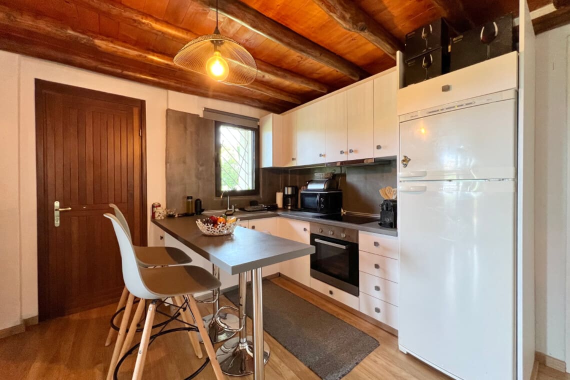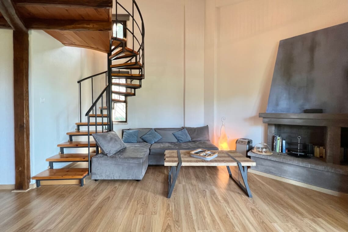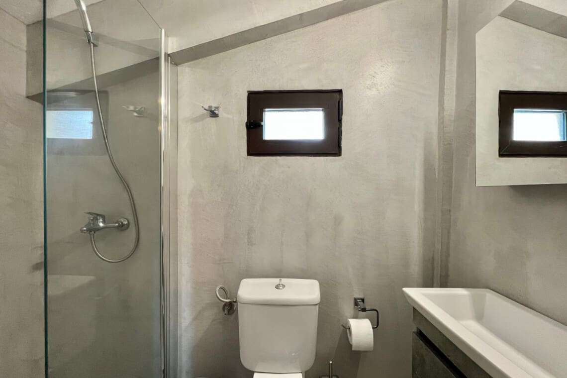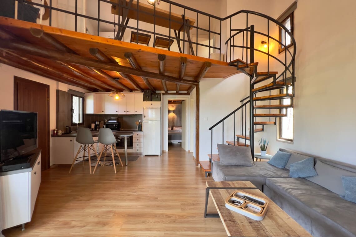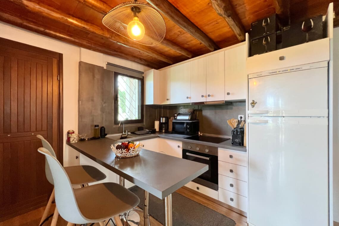 But there’s more! Dive into relaxation in not one, but two spacious living rooms, with the second perched on the upper floor, providing a perfect nook for reading, playing, or simply enjoying the serene views. Our relaxing villa has 2 modern bathrooms come equipped with rainfall shower heads, adding a touch of luxury to your refreshment times. Culinary enthusiasts will be delighted with our full kitchen, seamlessly connecting to the dining area, ensuring you have everything you need to whip up delightful meals with local produce. Step outside to the veranda and discover a delightful outdoor dining area for 6, perfect for enjoying meals under the warmth of the Greek sun or the stars. For the grill masters, our outdoor BBQ awaits, promising memorable evenings of delicious feasting.