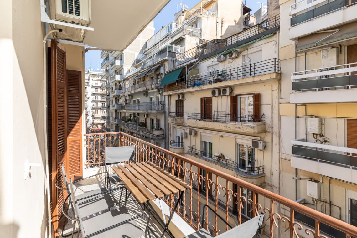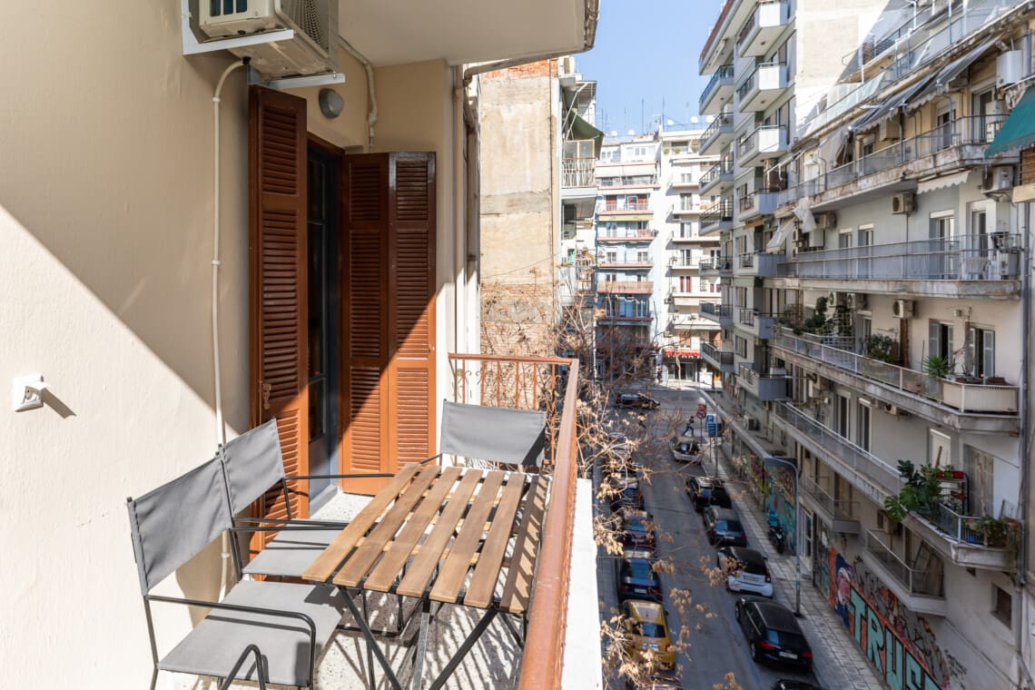 Από το μπαλκόνι μας, που βλέπει στο μπροστινό μέρος του κτηρίου, μπορείτε να απολαύσετε τη ζωντάνια της Θεσσαλονίκης..