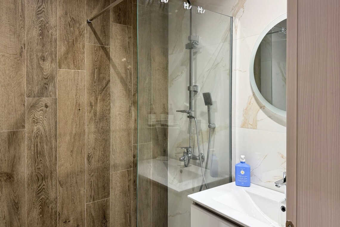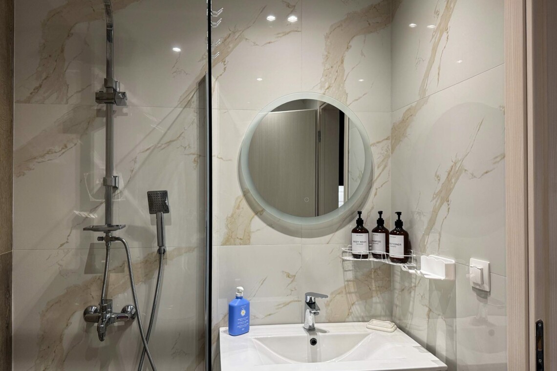 The bedroom offers a plush double bed with quality linens, ample storage space, and access to natural light through floor-to-ceiling curtains. The modern bathroom is fitted with a walk-in shower, clean tiling, a well-lit mirror, and high-quality toiletries, ensuring a refreshing experience every day.