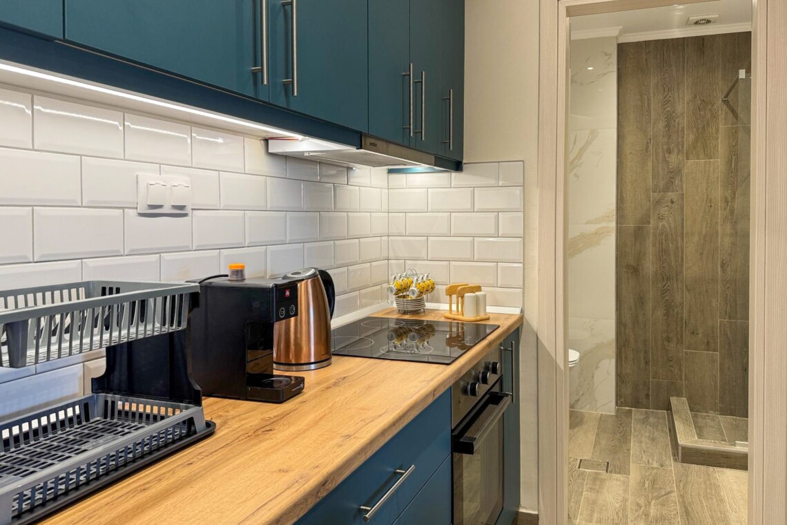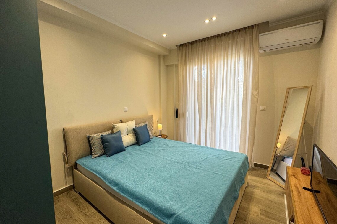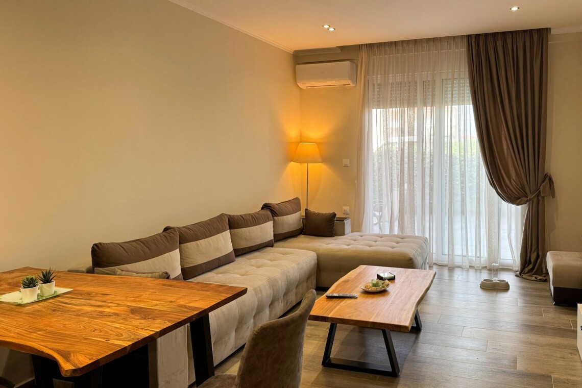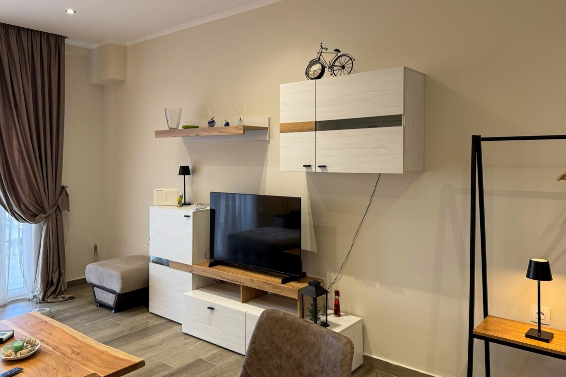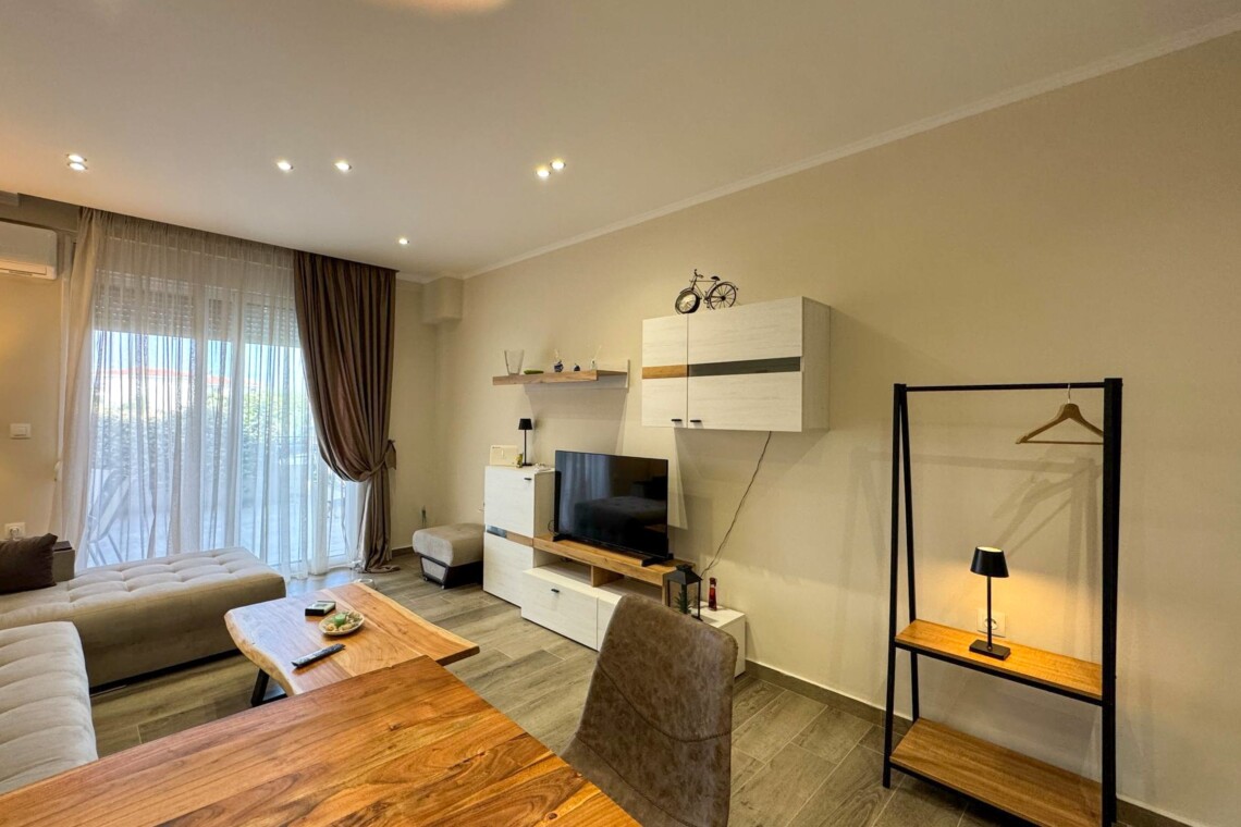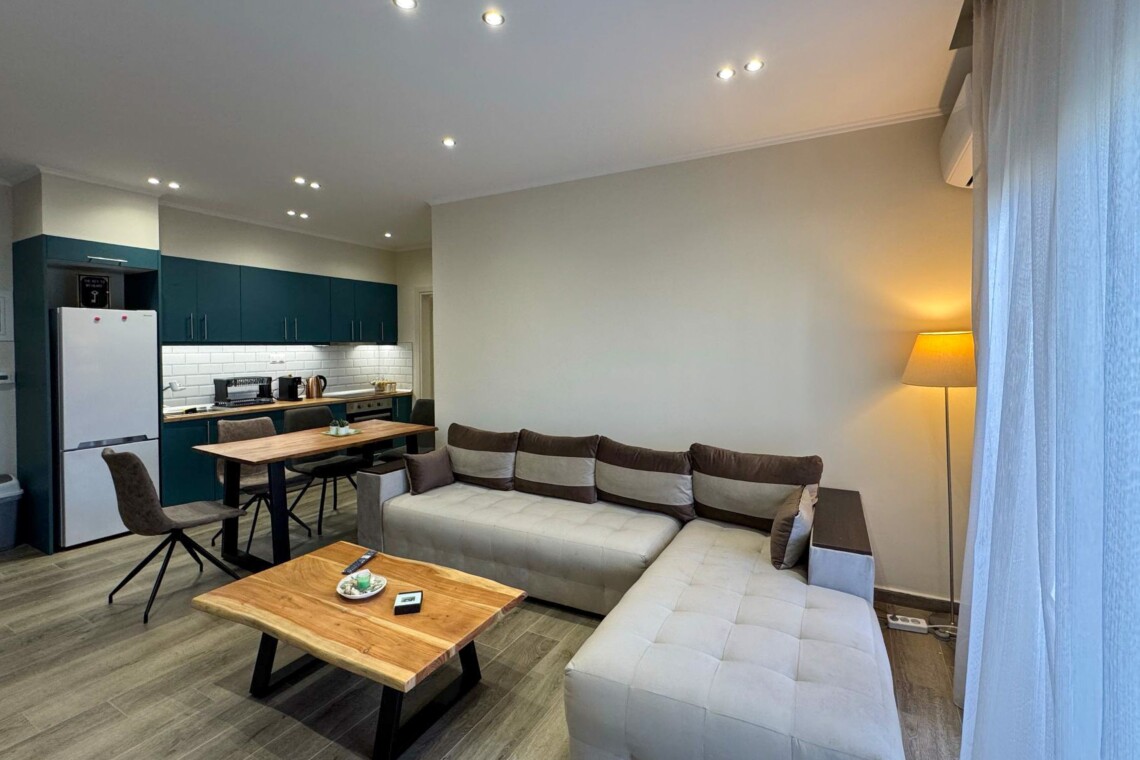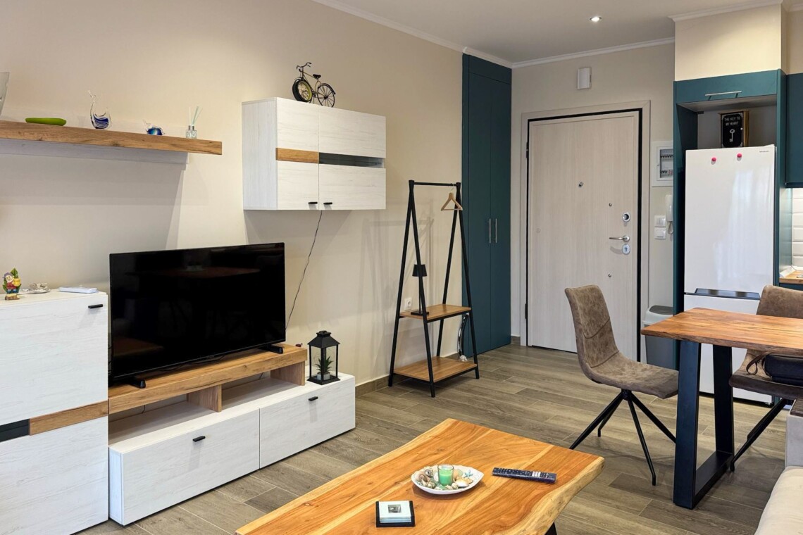 Welcome to Aloe by halu! Aloe is a stylish one-bedroom apartment located in the heart of Nea Moudania, perfect for couples or small families looking for a relaxing seaside escape. Designed with comfort and functionality in mind, Aloe features a beautifully furnished living room with a large corner sofa that converts into a bed, a smart TV, and an open-plan kitchen and dining area. The kitchen is fully equipped with modern appliances, making it ideal for long or short stays.