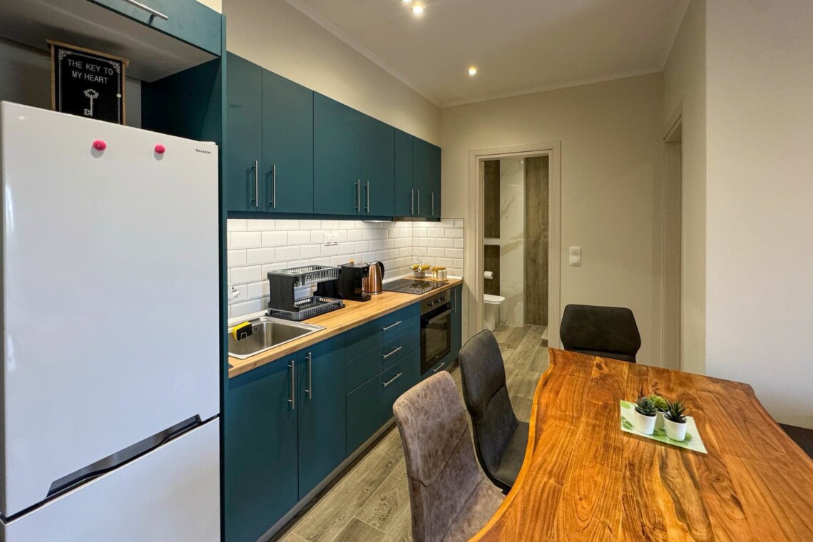 Additional amenities include a washing machine, ironing equipment, air conditioning, and high-speed Wi-Fi, making this apartment ideal for both holidaymakers and remote workers.