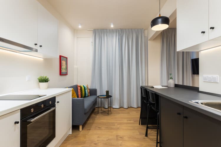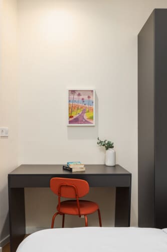 For added comfort, the apartment is air-conditioned and features soundproof walls, ensuring a quiet and restful atmosphere. The seating area is the ideal spot to relax with a book or enjoy a morning coffee, while the large windows offer a charming view of the peaceful street below. A washing machine is also available, making it perfect for longer stays.