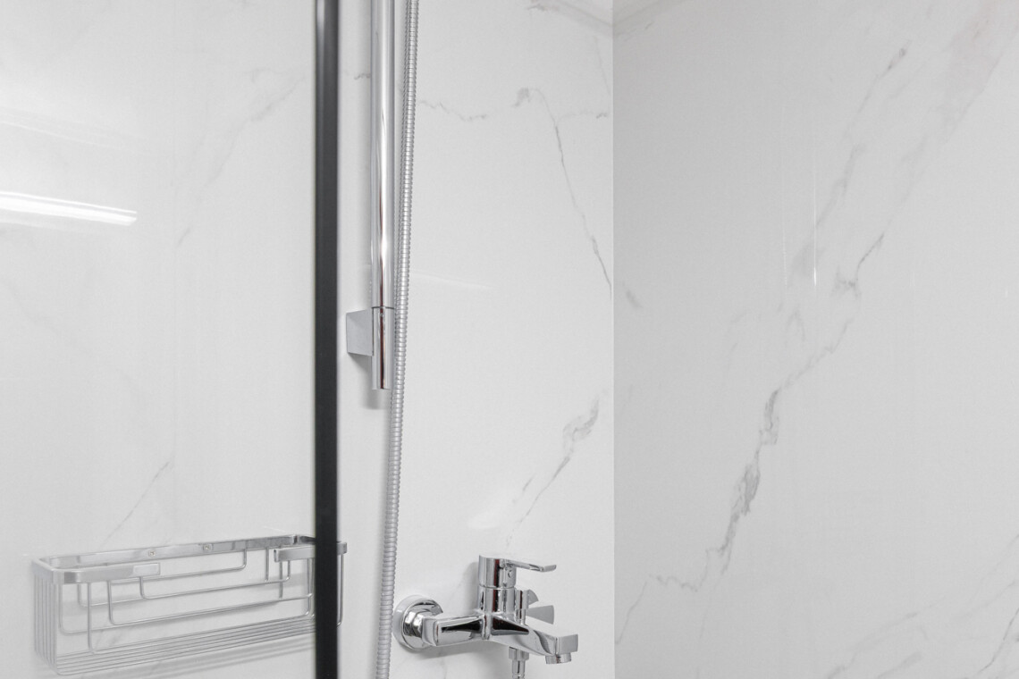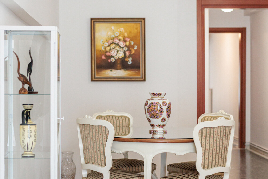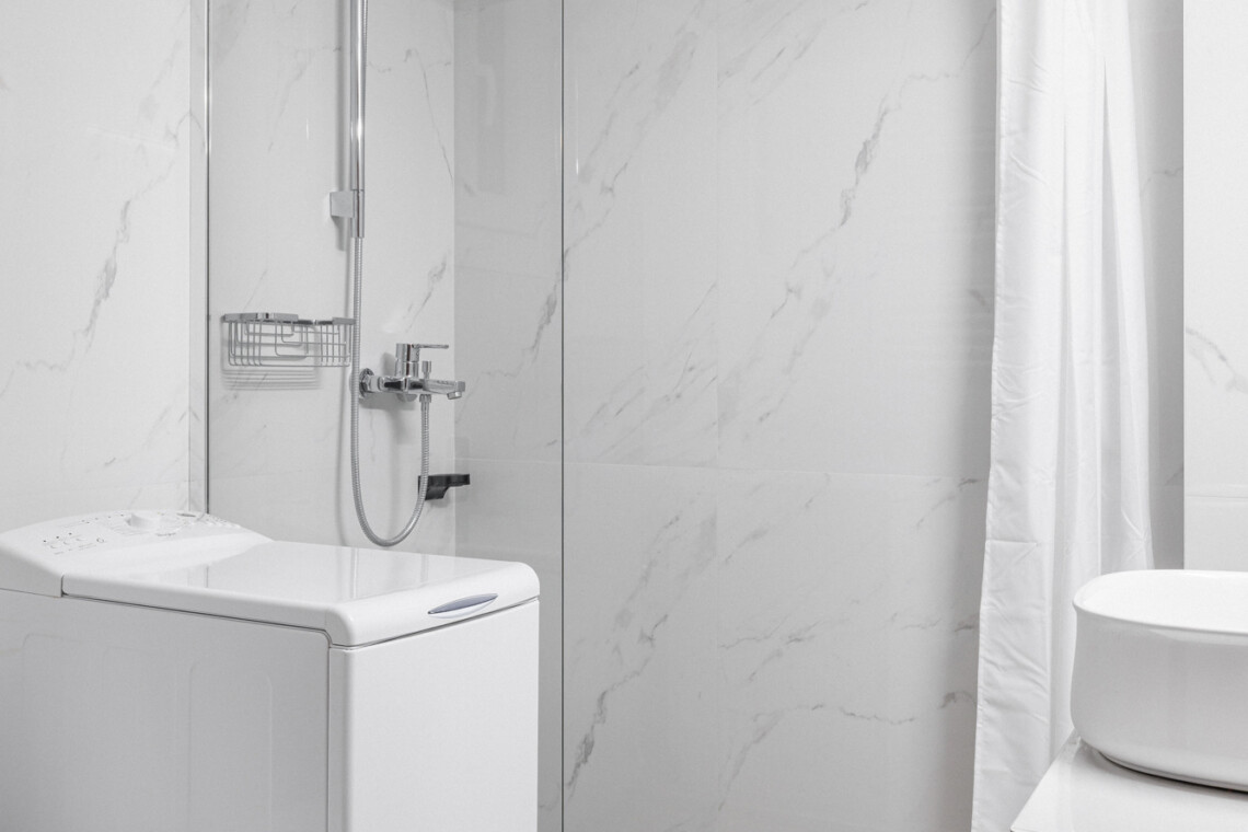 Inside, you will find two spacious bedrooms with queen-size beds, a bright living and dining area with elegant classical décor, and a fully equipped kitchen where you can prepare your favorite meals. The stylish bathroom comes with a walk-in shower and washing machine, ensuring both convenience and comfort during your stay.