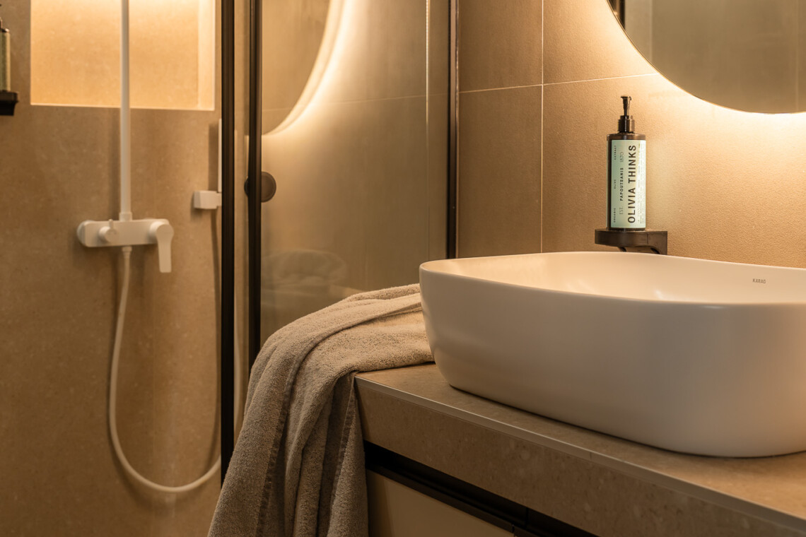 The bathroom is sleek and modern, with a walk-in shower, elegant finishes and plush towels that give a refined, boutique feel. Natural light flows into the studio through large windows, while neutral tones and curated decor create a sense of calm and balance.