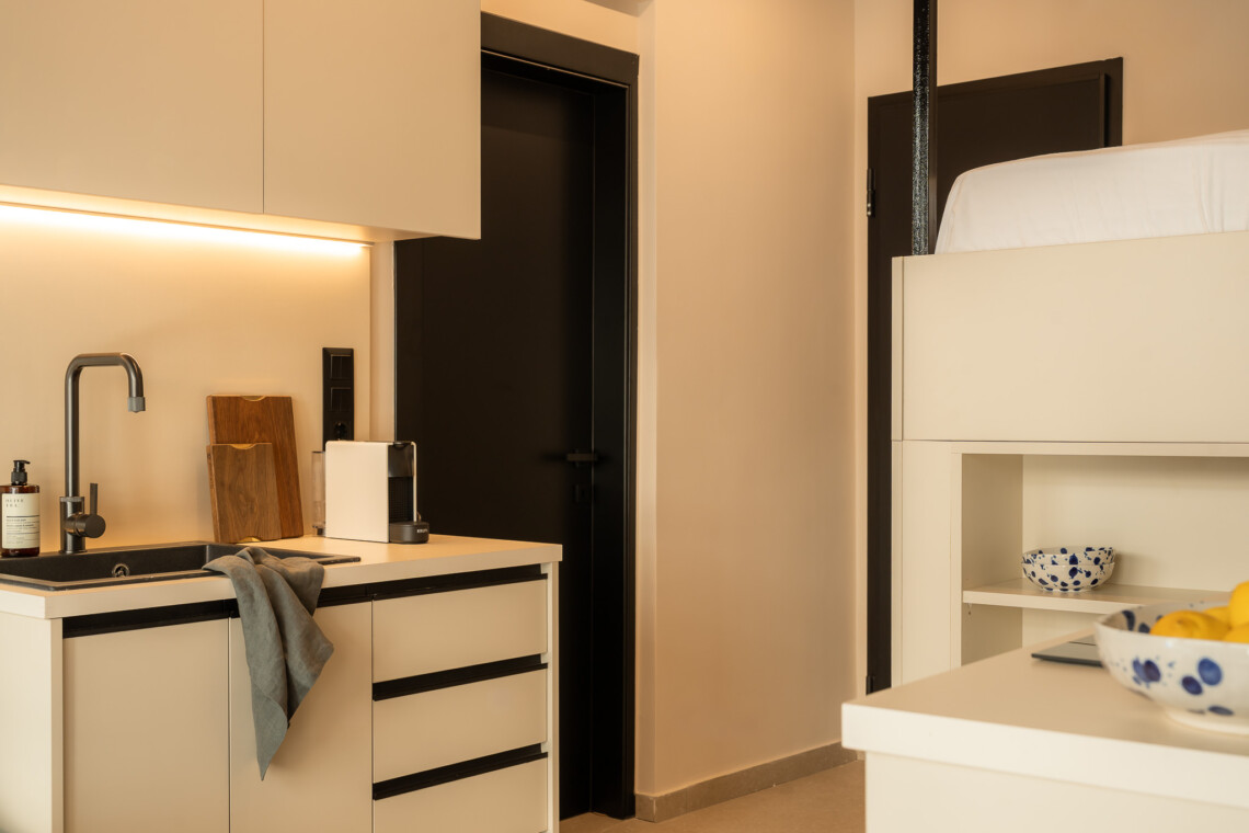 The Studio Apartment at FOS is a compact and beautifully designed space that offers everything needed for a comfortable and stylish stay in Thessaloniki. Ideal for couples or friends, the studio is located in a newly built residence in the heart of Toumpa and reflects halu’s modern approach to functional and elegant city living.