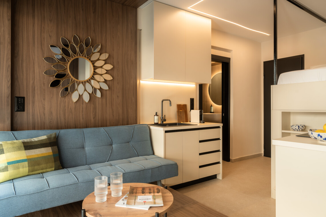 The sleeping area features a cozy double bed with soft linens and warm lighting, creating a relaxed and intimate atmosphere. Right next to the bed is a contemporary sofa that easily transforms into a bed, making the studio suitable for up to three guests. The layout has been thoughtfully planned to maximize space without compromising on style or comfort.