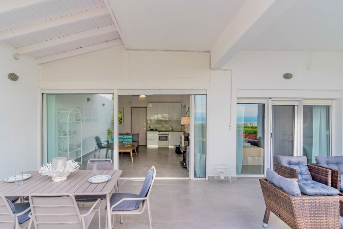 Our villa comfortably sleeps up to 4 guests in 2 beautifully decorated bedrooms, each boasting a comfortable queen-size bed. Wake up to the soothing sounds of the waves in the master bedroom, which also features an ensuite bathroom for added privacy and convenience. Enjoy the open-plan living room, designed for relaxation and quality time with loved ones. The space is bathed in natural light, offering serene sea views that promise to captivate. The full kitchen is equipped with everything you need to prepare delicious meals. Step outside to the veranda, where you’ll find a lovely dining area perfect for alfresco meals while soaking up the stunning seaside ambiance. A modern bathroom complete with a rainfall showerhead ensures all guests can refresh and rejuvenate in comfort. Savor the mesmerizing sunsets from the privacy of your veranda, an ideal spot for memorable dinners or simply unwinding with a good book. Benefit from the convenience of free street parking around the property, making exploring the surrounding area hassle-free.